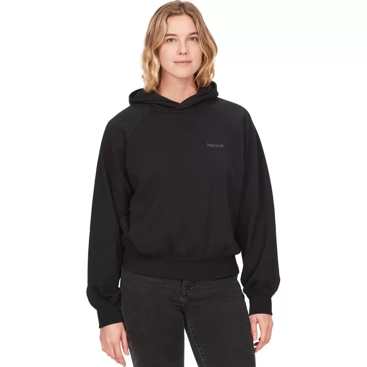 The Marmot Women's Rowan Relaxed Hoody is a versatile and eco-friendly garment designed to provide comfort and style for both outdoor adventures and casual wear. Crafted from a sustainable blend of post-consumer recycled polyester and cotton, this hoody offers a soft, breathable fabric that ensures comfort throughout the day. Featuring a relaxed fit, the Rowan Hoody includes raglan sleeves that enhance mobility and a stretchy funnel neck for added warmth and versatility. The cozy fleece back panel provides additional insulation, making it ideal for layering during cooler temperatures. This item is a Sales Sample from the Manufacturer.