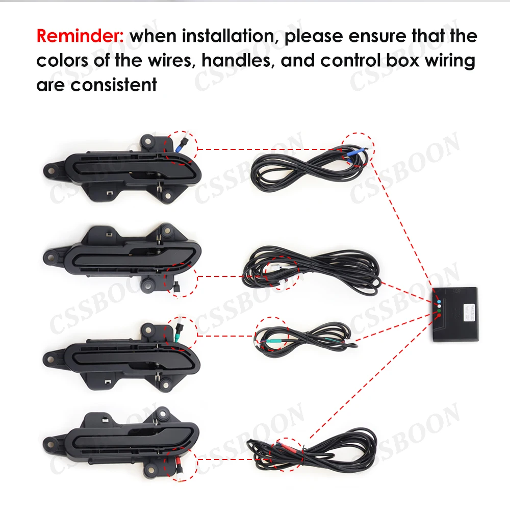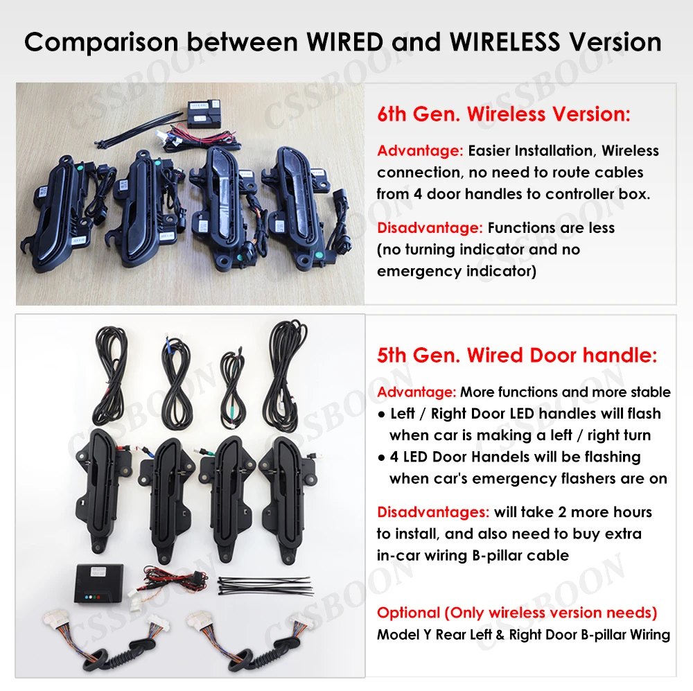 2. Wired install auto door handle cost much more time more than wireless auto door handle, however, wireless auto door handle has 6pcs of bluetooth module, wireless auto door handle only has 1 bluetooth module inside the control box. Its quality is more stable.