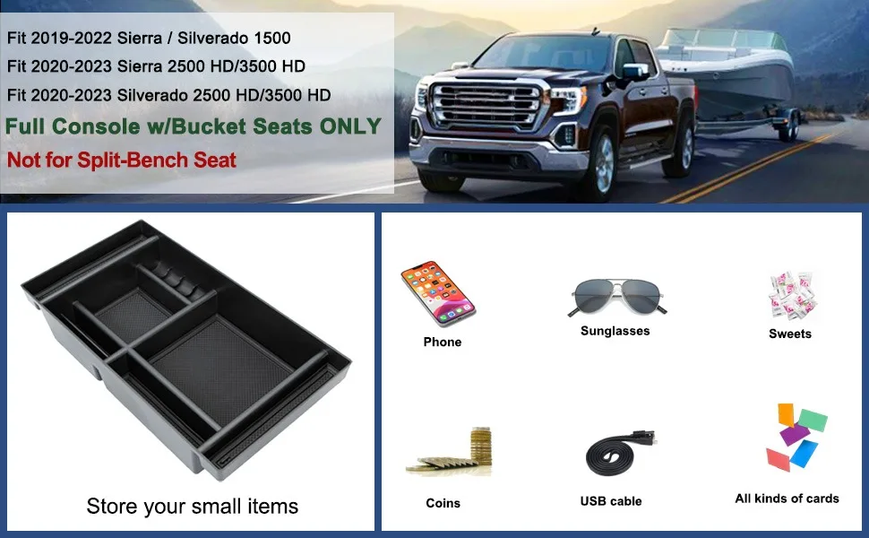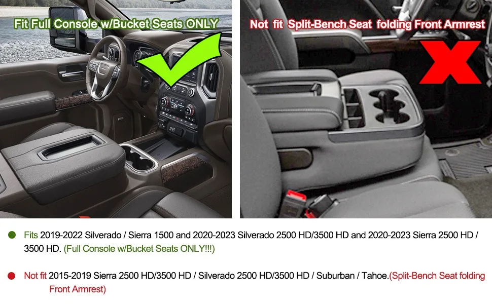 • For GMC SIERRA: Fits for 2019-2022 GMC Sierra 1500 and 2020-2023 GMC Sierra 2500 HD/3500 HD, including SLE, SLT, Elevation, AT4, and Denali (Full console w/bucket seats ONLY)