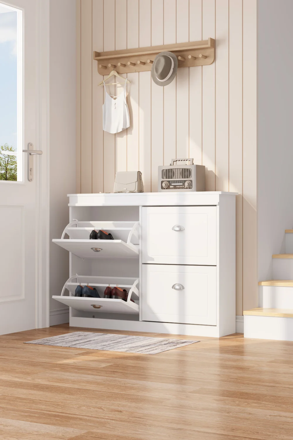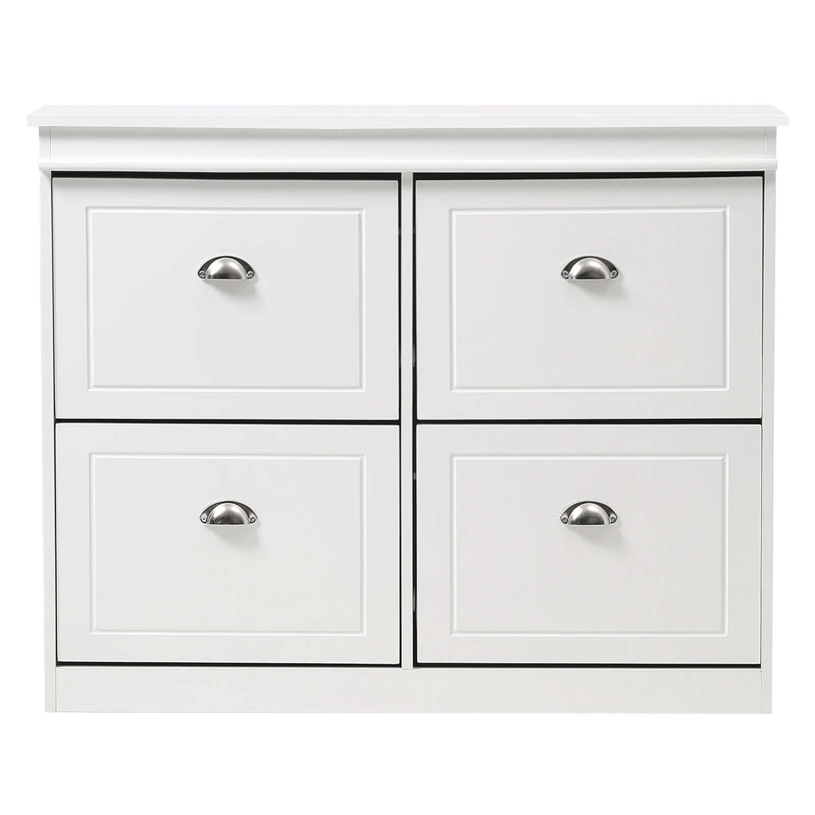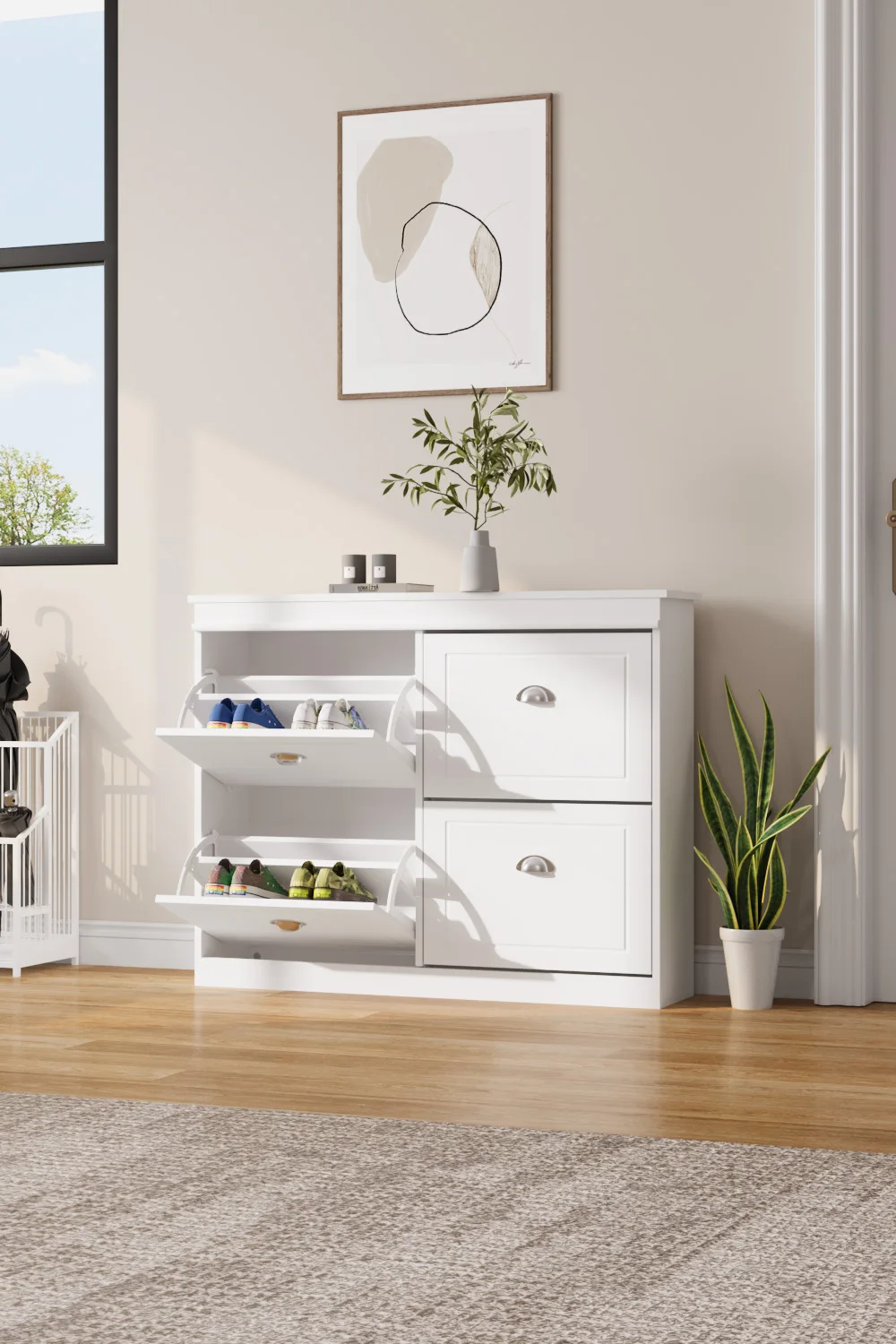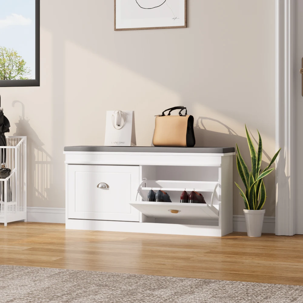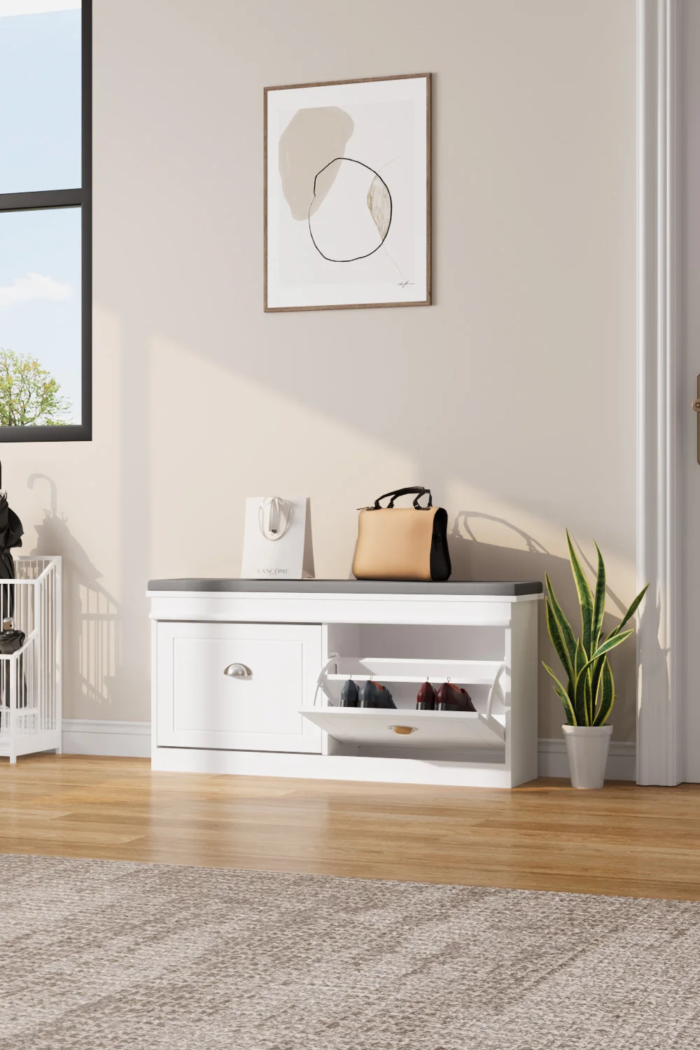 This flip down shoe cabinet, finished in a sleek white with silver handles, offers an elegant and low-key design to enhance any entryway. Equipped with two built-in shoe racks, it provides ample space to accommodate various types of shoes, keeping your entrance clean and tidy. No more shoes piling up behind your door, this shoe bench cabinet offers modern organization to keep your shoes out of sight.