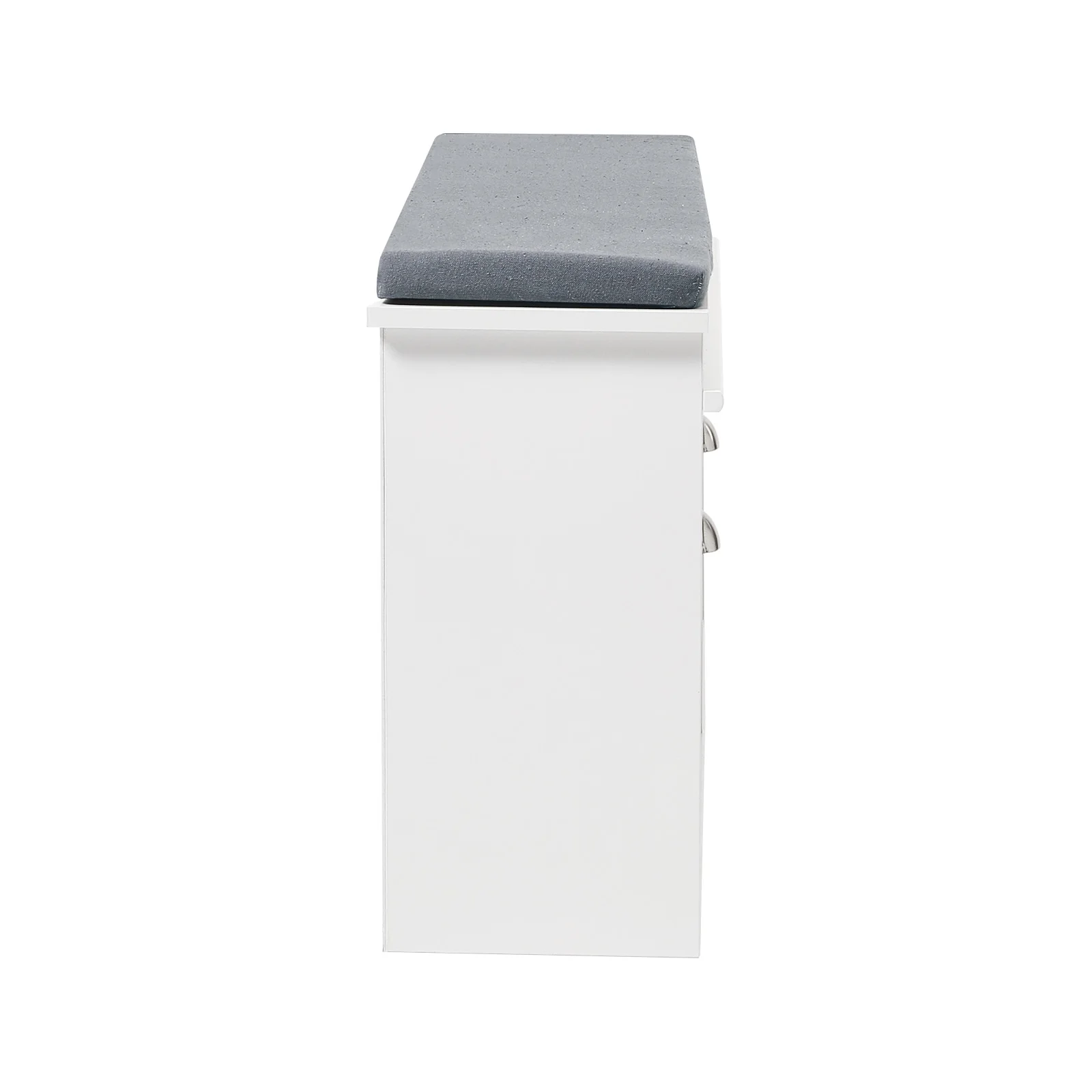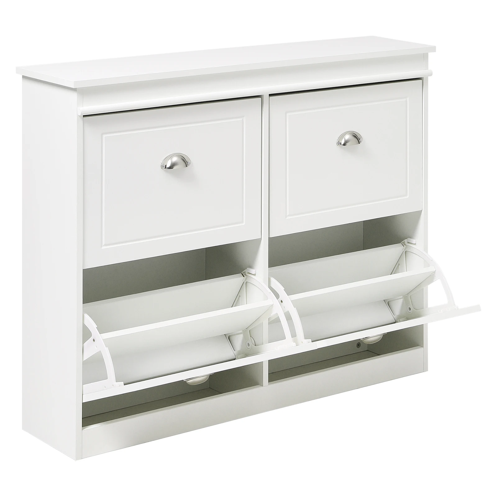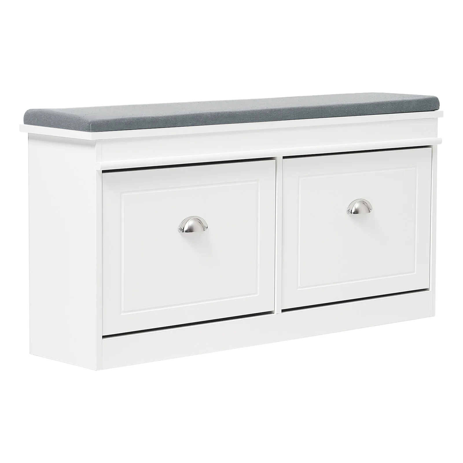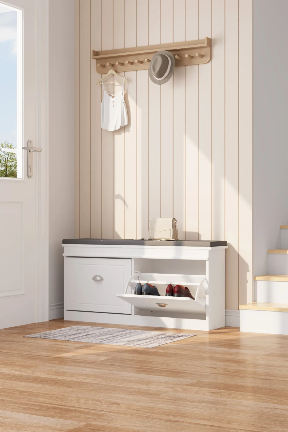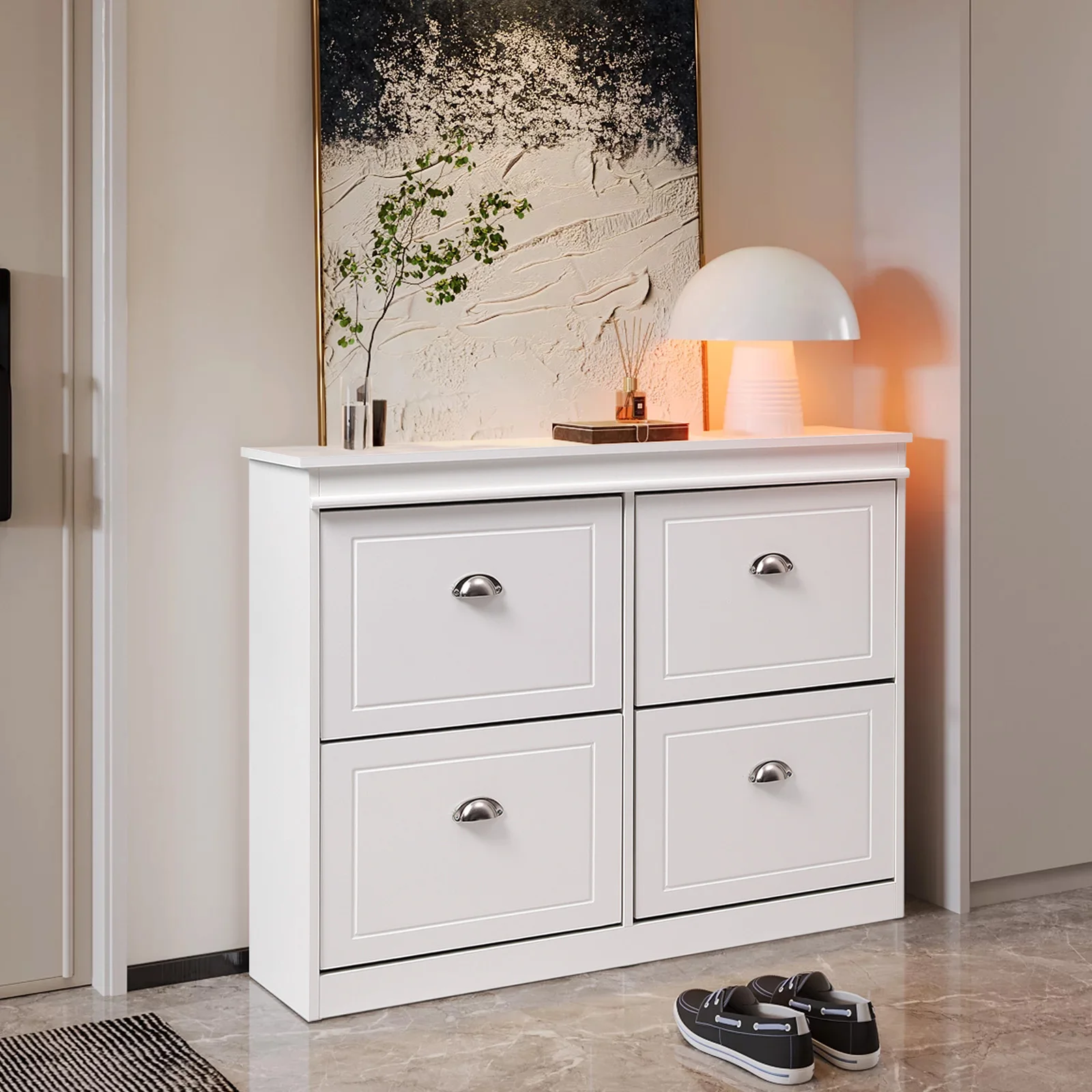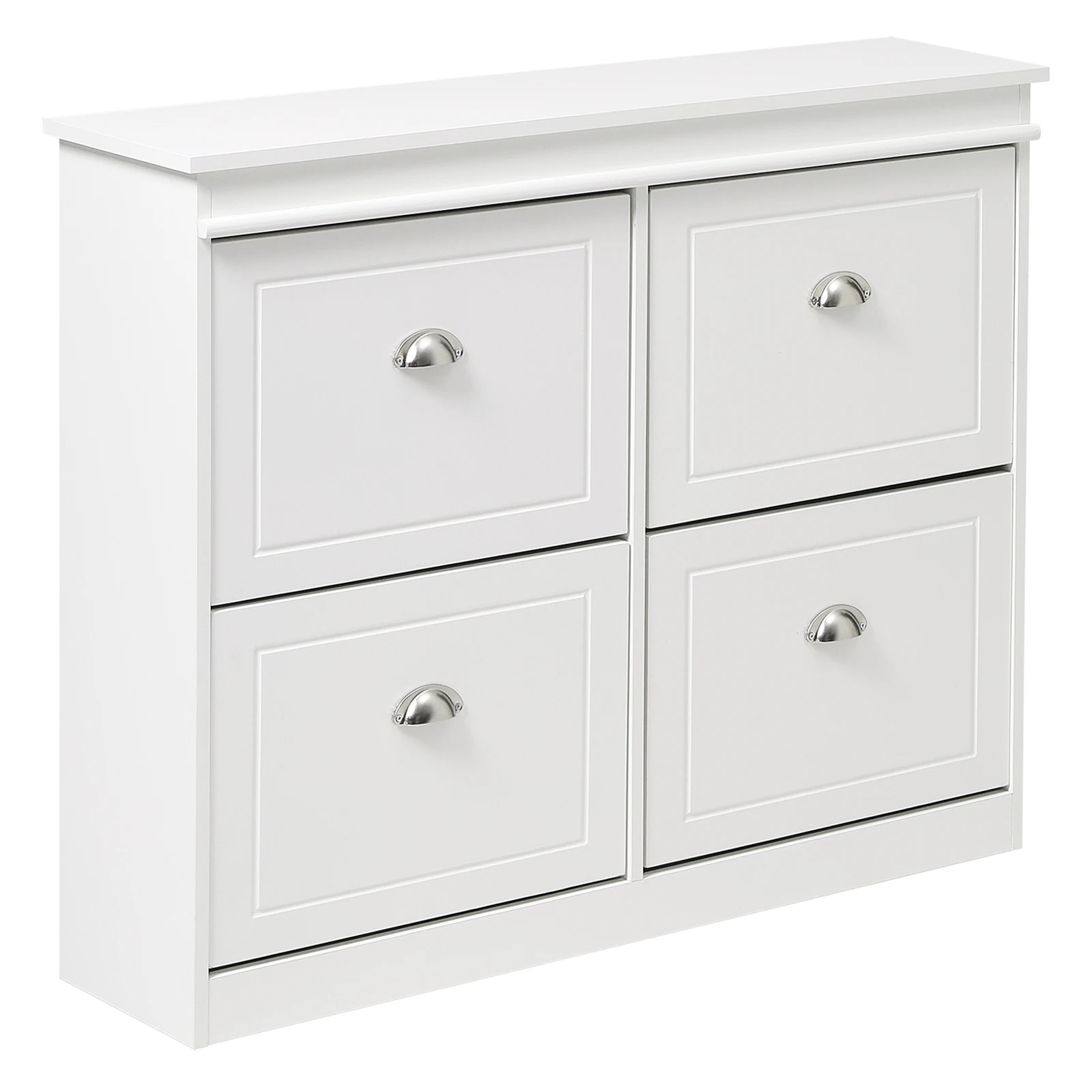 This flip down shoe cabinet, finished in a sleek white with silver handles, offers an elegant and low-key design to enhance any entryway. Equipped with two built-in shoe racks, it provides ample space to accommodate various types of shoes, keeping your entrance clean and tidy. No more shoes piling up behind your door, this shoe bench cabinet offers modern organization to keep your shoes out of sight.