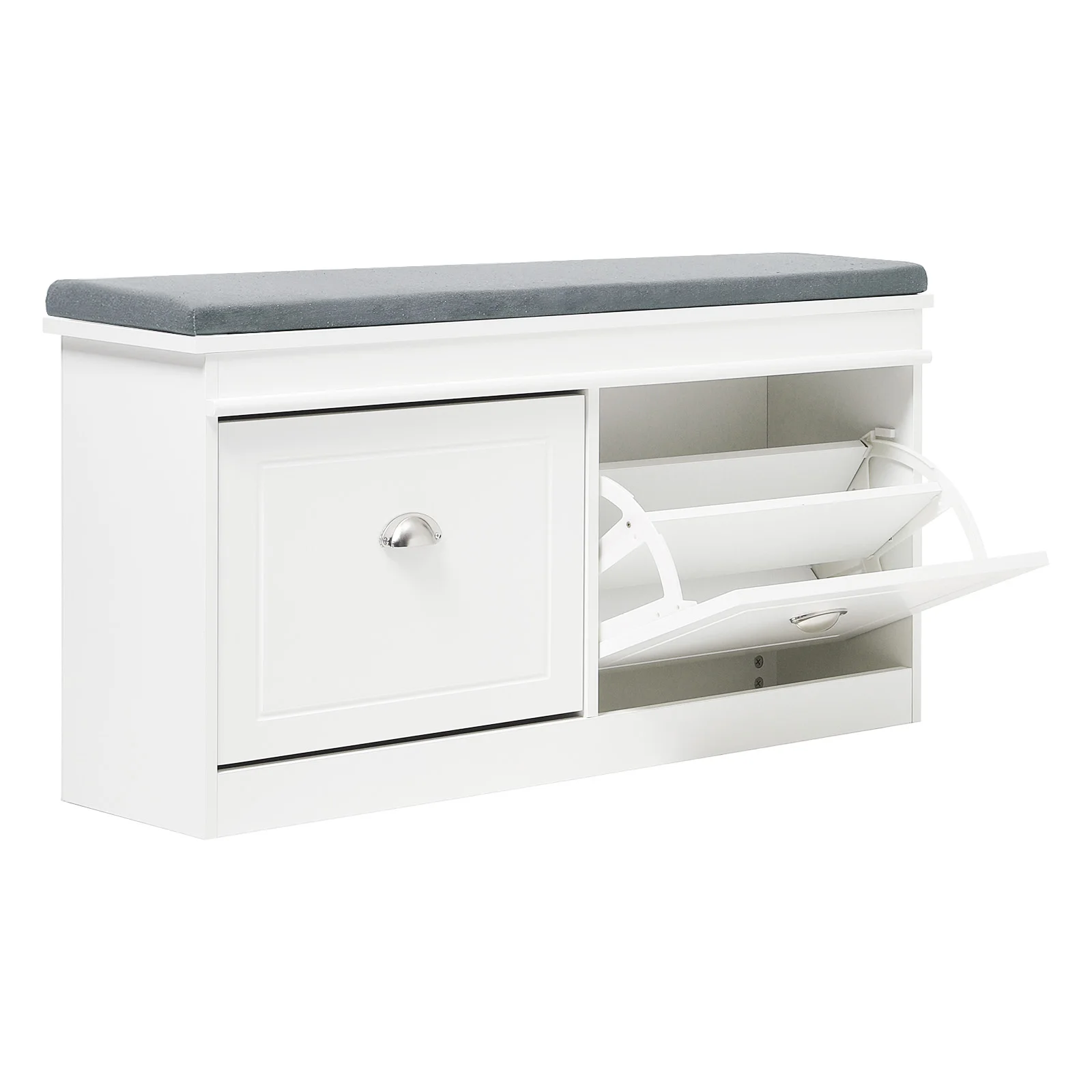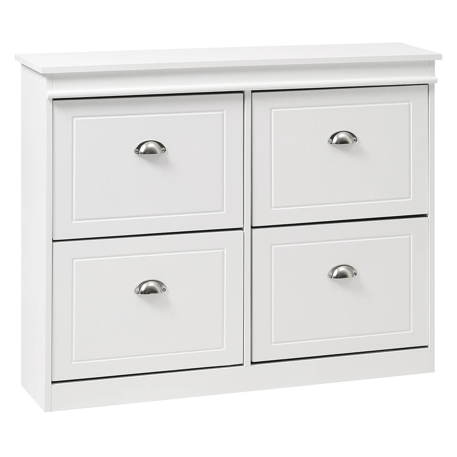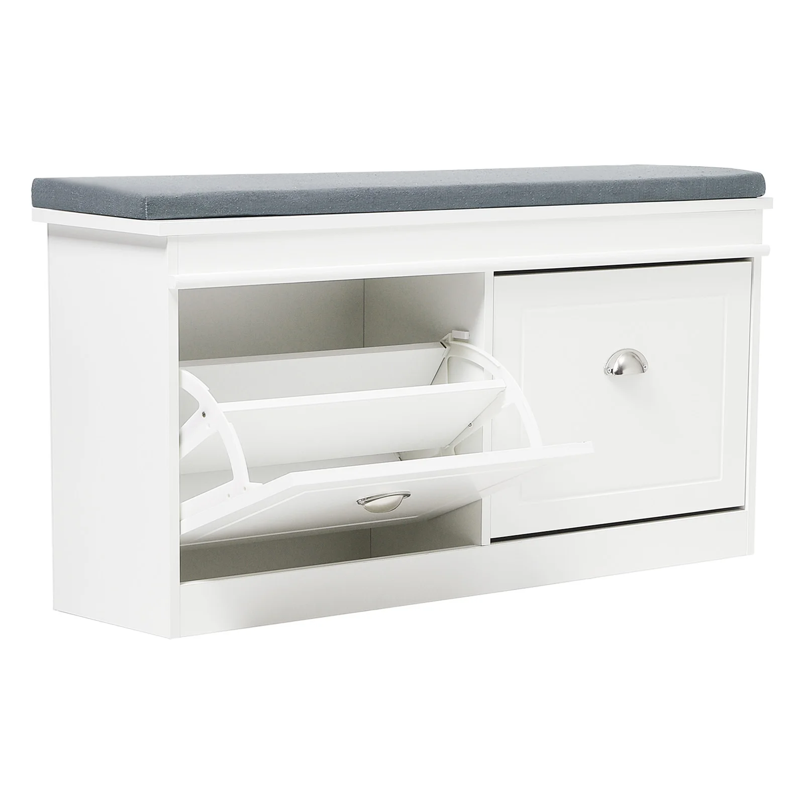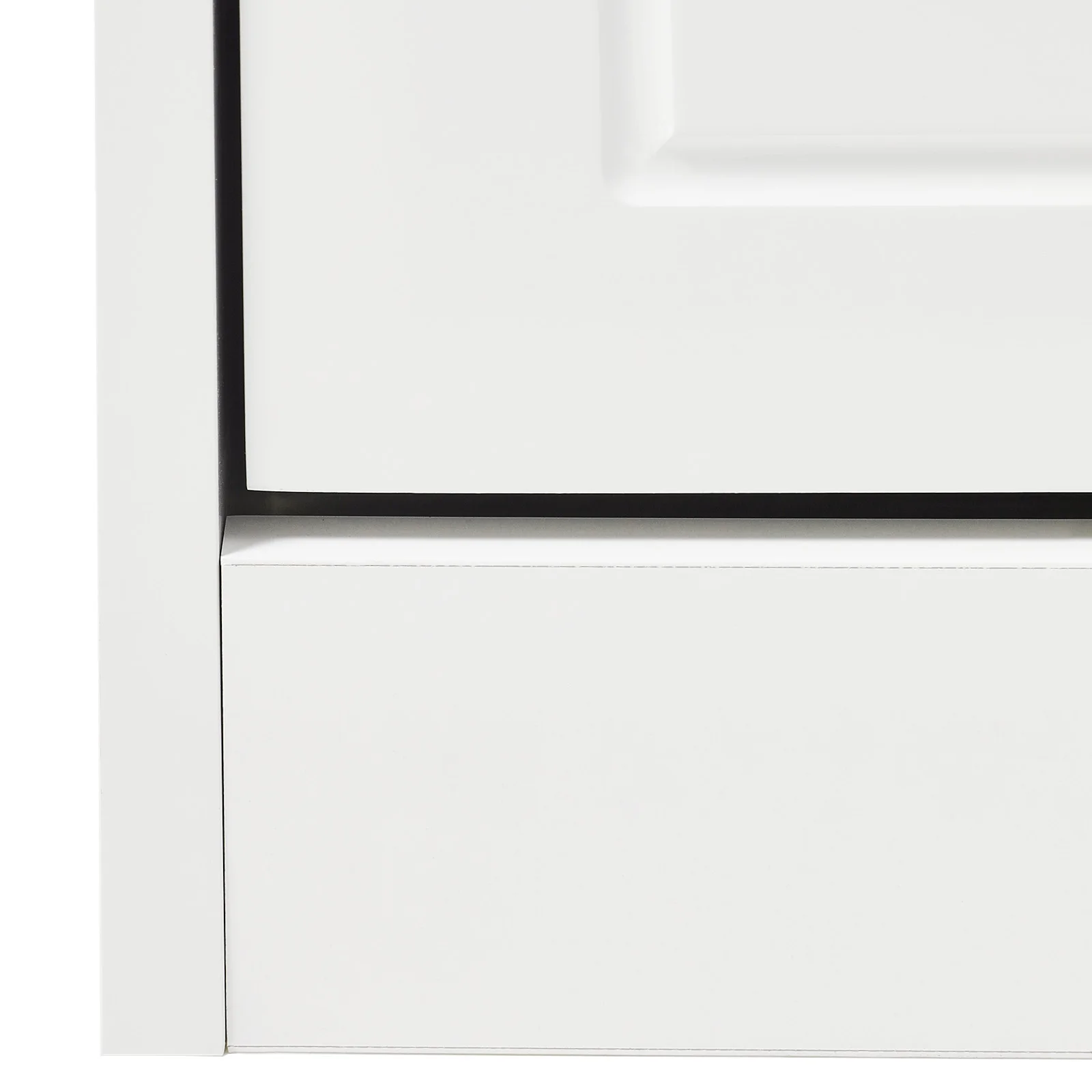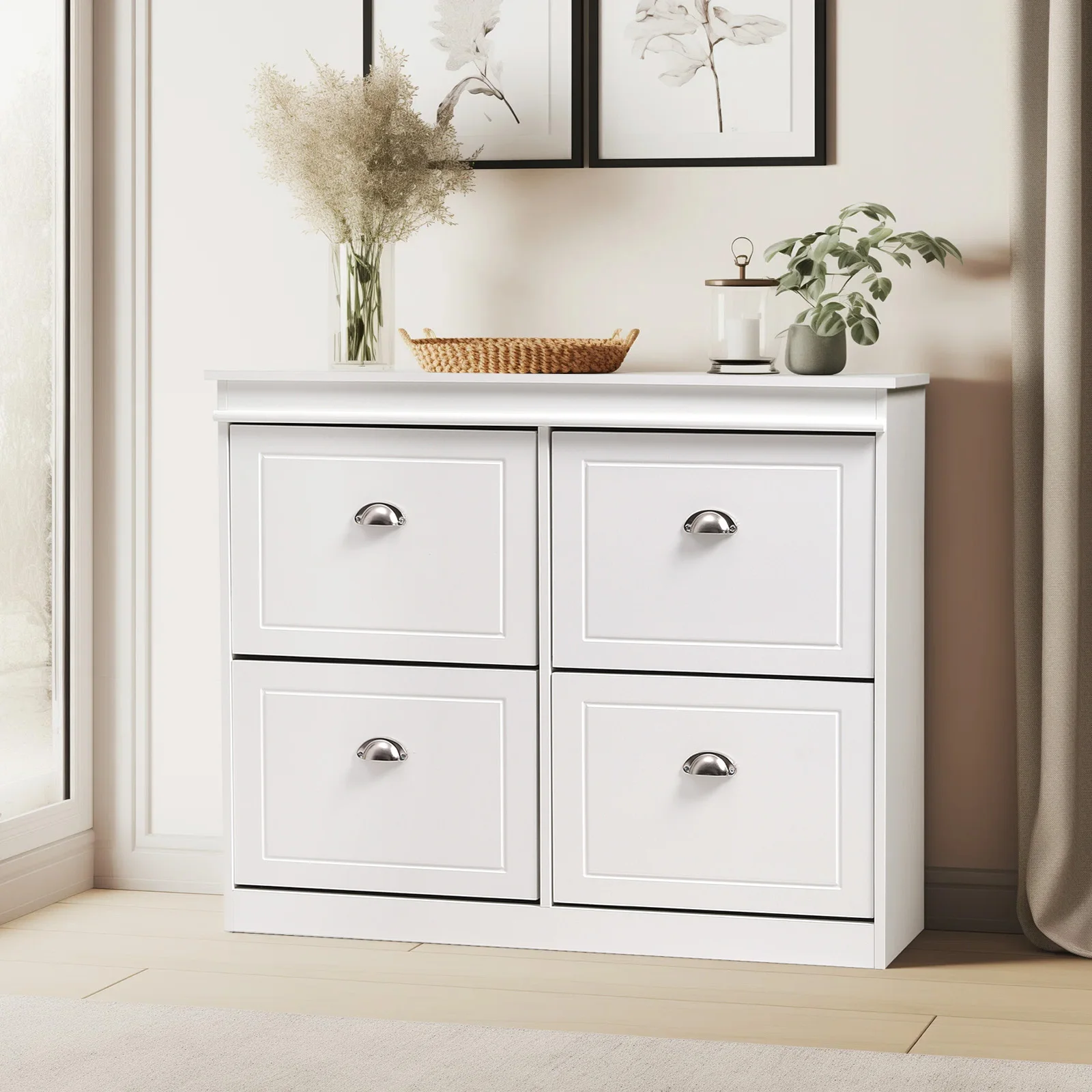 This flip down shoe cabinet, finished in a sleek white with silver handles, offers an elegant and low-key design to enhance any entryway. Equipped with two built-in shoe racks, it provides ample space to accommodate various types of shoes, keeping your entrance clean and tidy. No more shoes piling up behind your door, this shoe bench cabinet offers modern organization to keep your shoes out of sight.