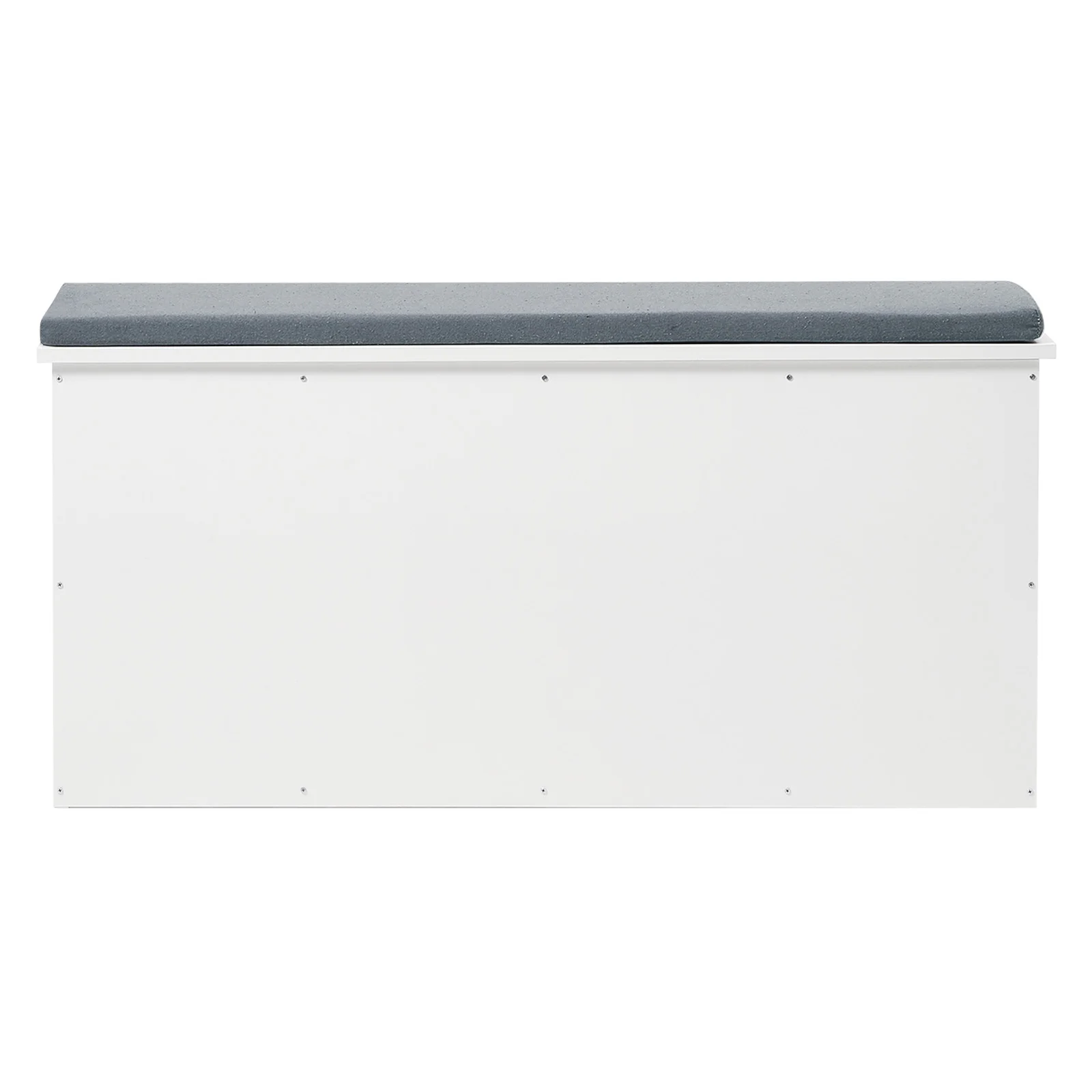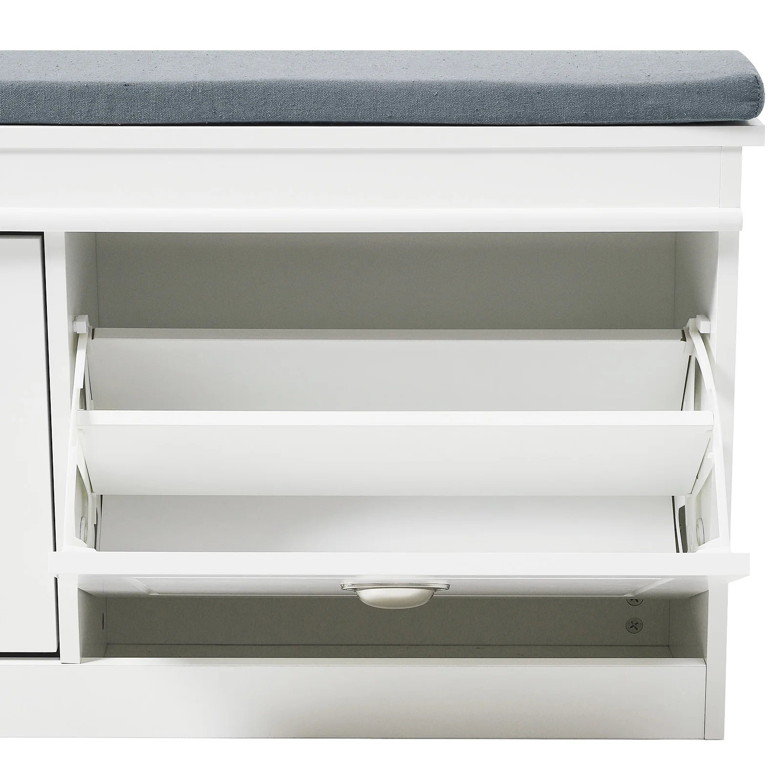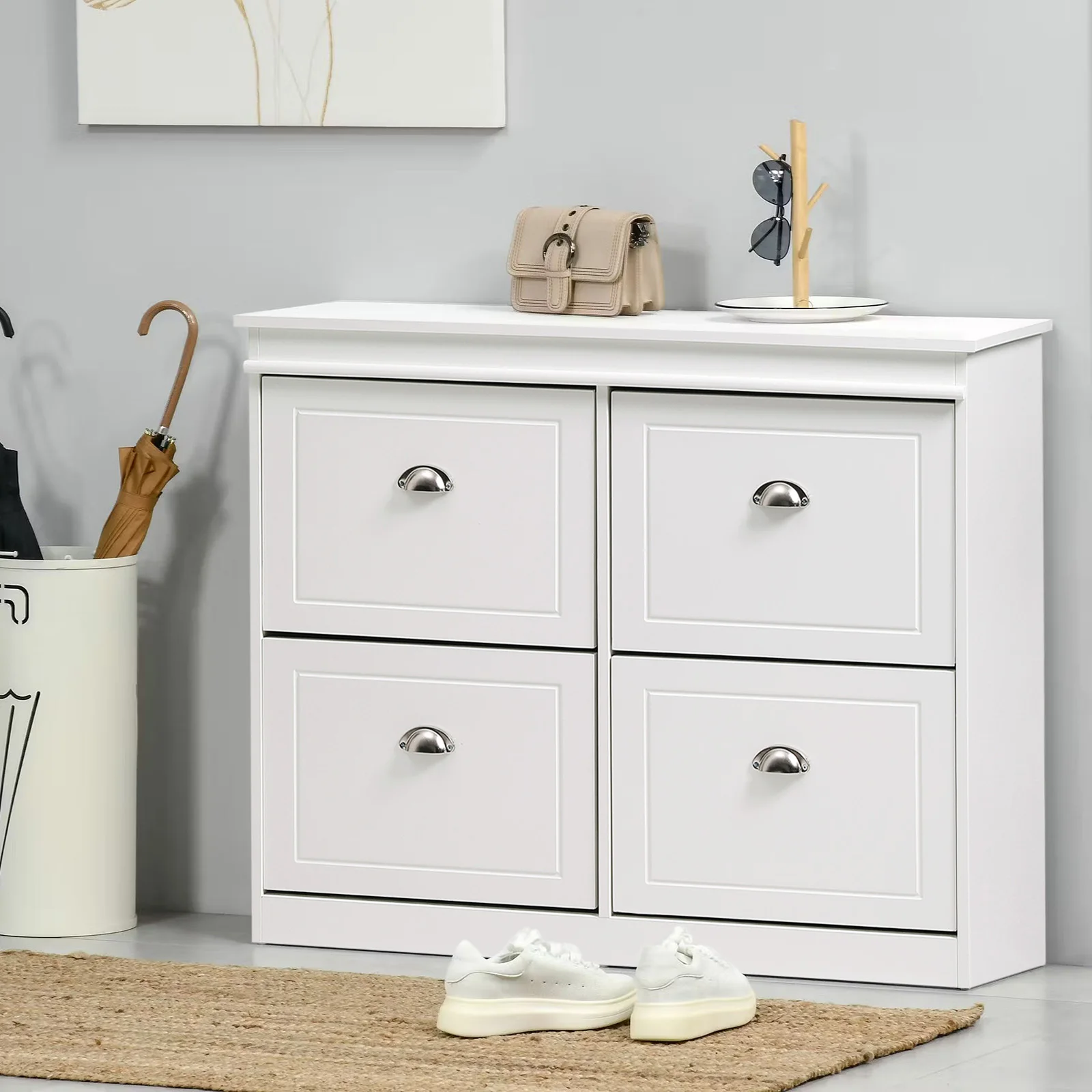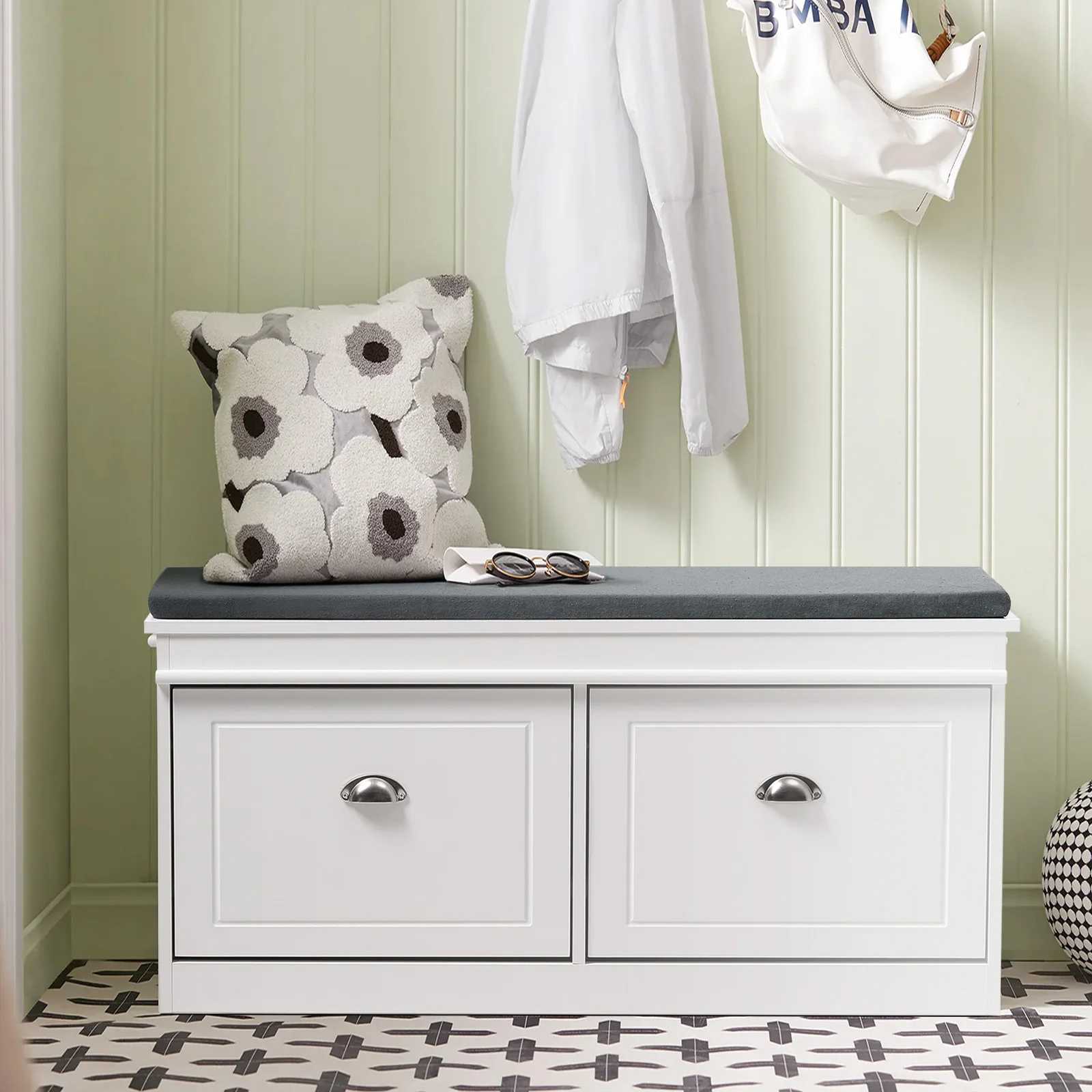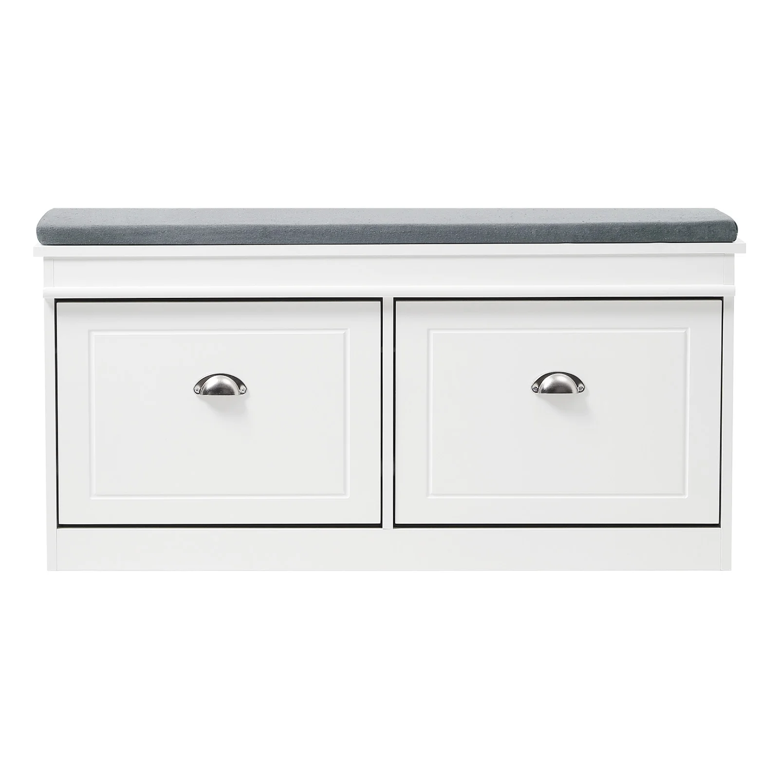 This flip down shoe cabinet, finished in a sleek white with silver handles, offers an elegant and low-key design to enhance any entryway. Equipped with two built-in shoe racks, it provides ample space to accommodate various types of shoes, keeping your entrance clean and tidy. No more shoes piling up behind your door, this shoe bench cabinet offers modern organization to keep your shoes out of sight.