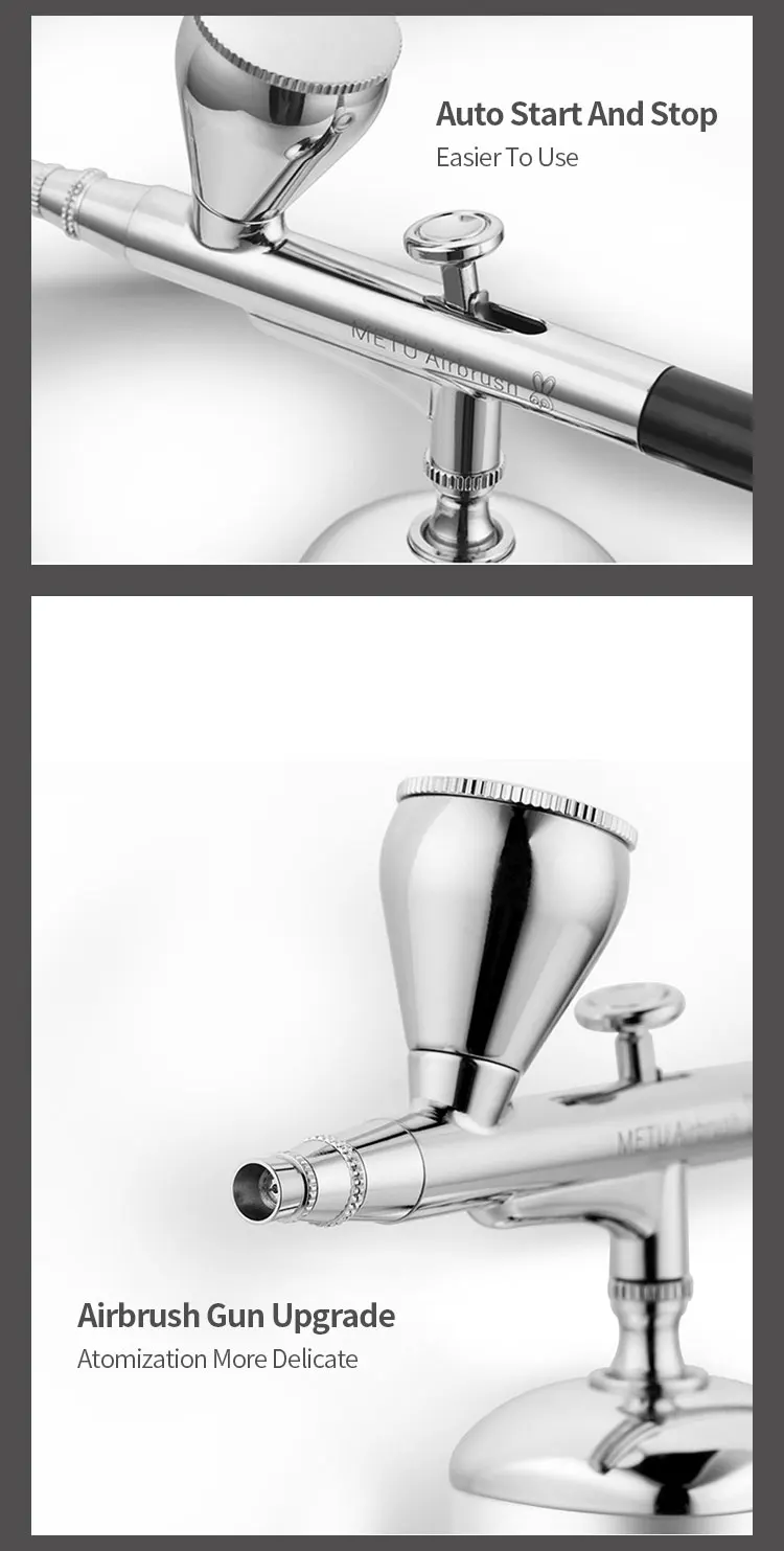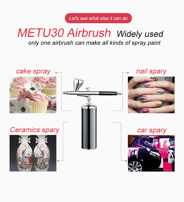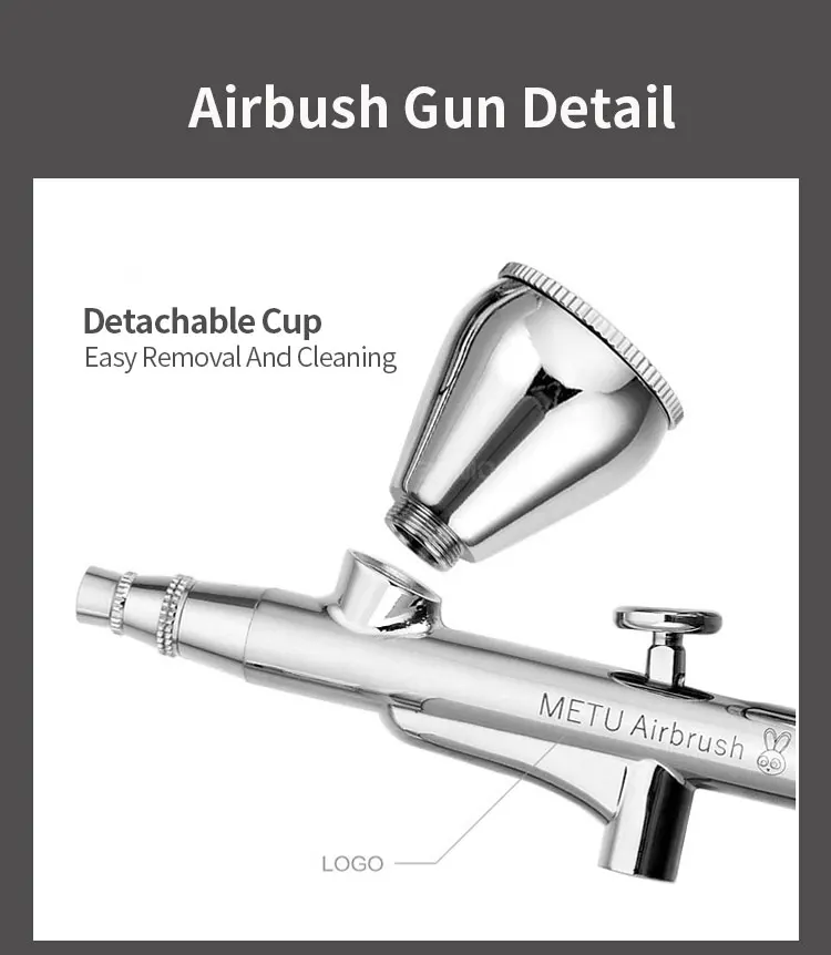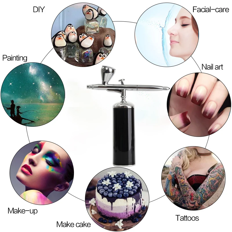 The gravity feed dual-action airbrush is perfect for commercial arts, illustrations, photo retouching, crafts and many other hobbies, such as drawing, painting, cake decorating, cosmetics, nail art, tanning, temporary tattos and so on.