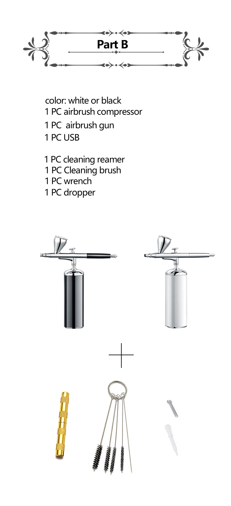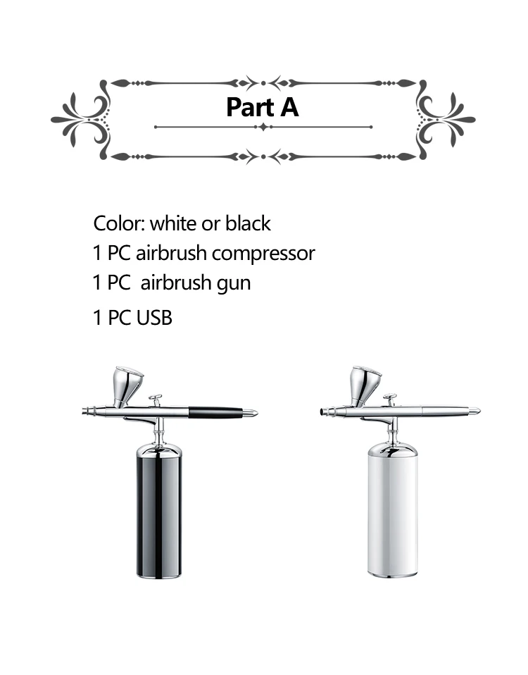 Productis specially suited for airbrush tanning,skin care.temporary tattoo,nail beauty,make-up,painting t-shirt,art designing,hair beauty,advertising spray,and any other spray.
