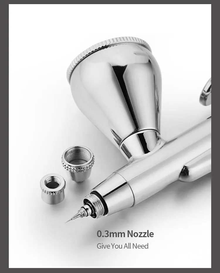 Nozzle: 0.3mm; Gravity Feed: 7CC fluid cup with lid.
