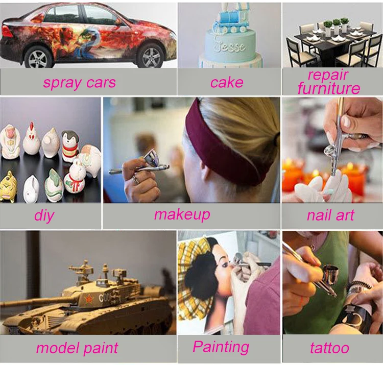 This beauty special air compressor only for makeup, beauty, nail, temporary tattoos, cake decorating, etc. low dense degree of dye, and shall not be used for spraying thick paint.