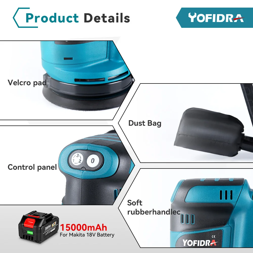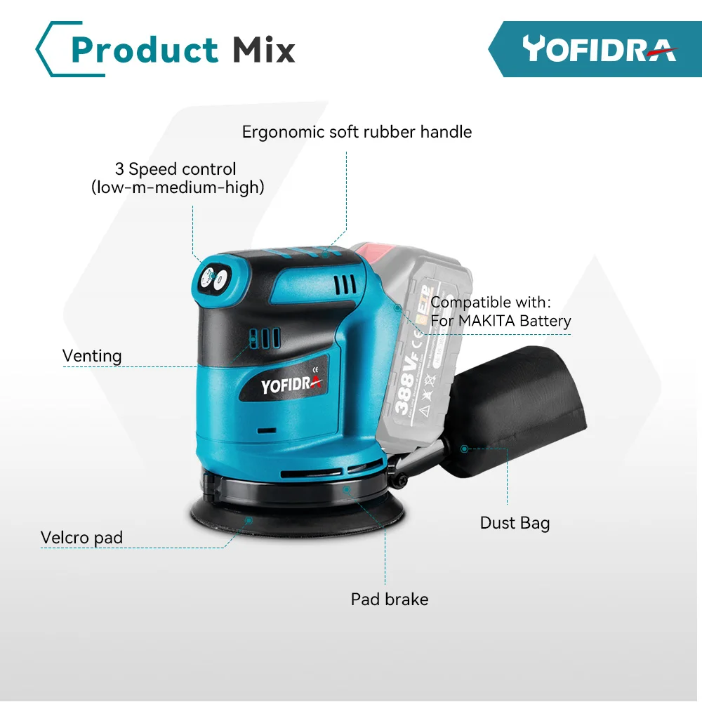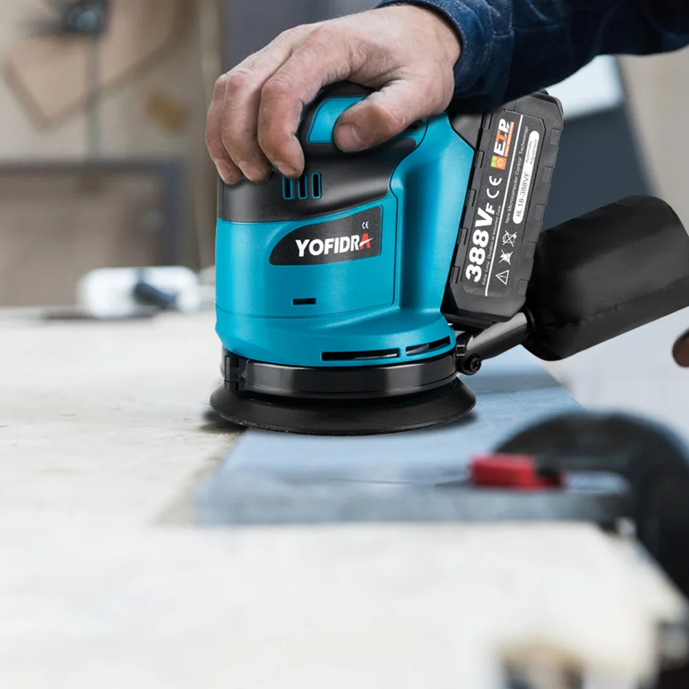 Yofidra 5 Inch Electric Orbital Sander 3 Speed Adjustable Cordless Rechargeable Woodworking Power Tool For 18V Battery