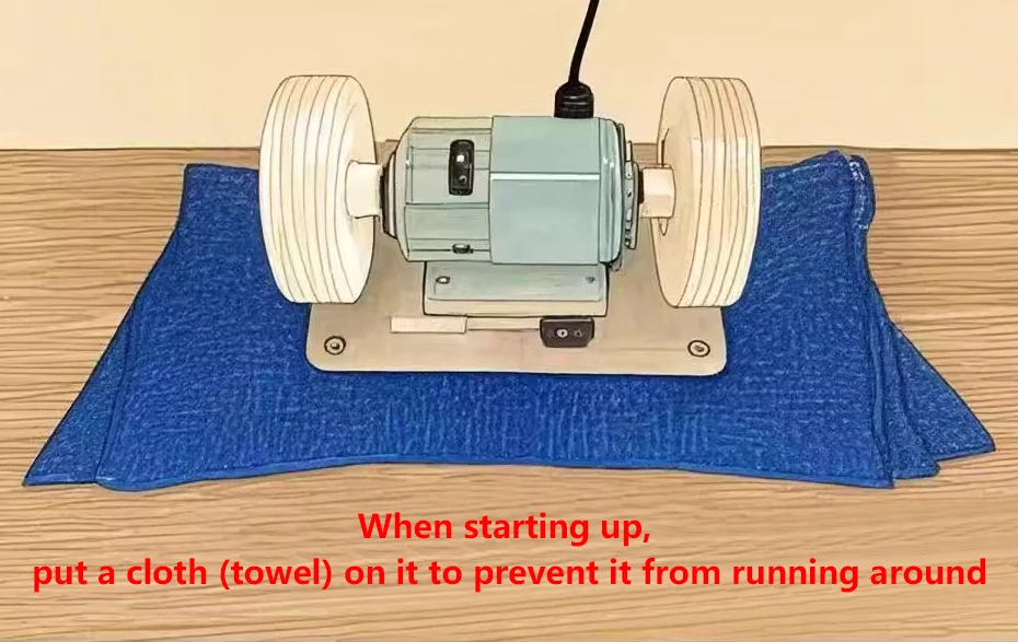 Note: When using the grinding wheel machine, running may occur due to dry tabletop or ground vibration. Simply place a cloth under the machine. (Wet cloths and stacking multiple layers of cloths have better results.)