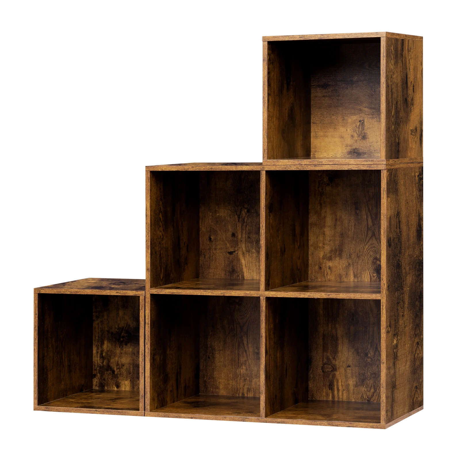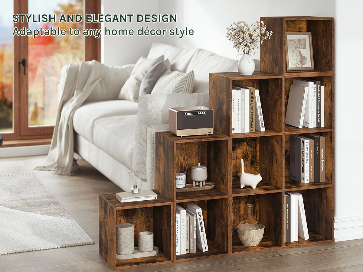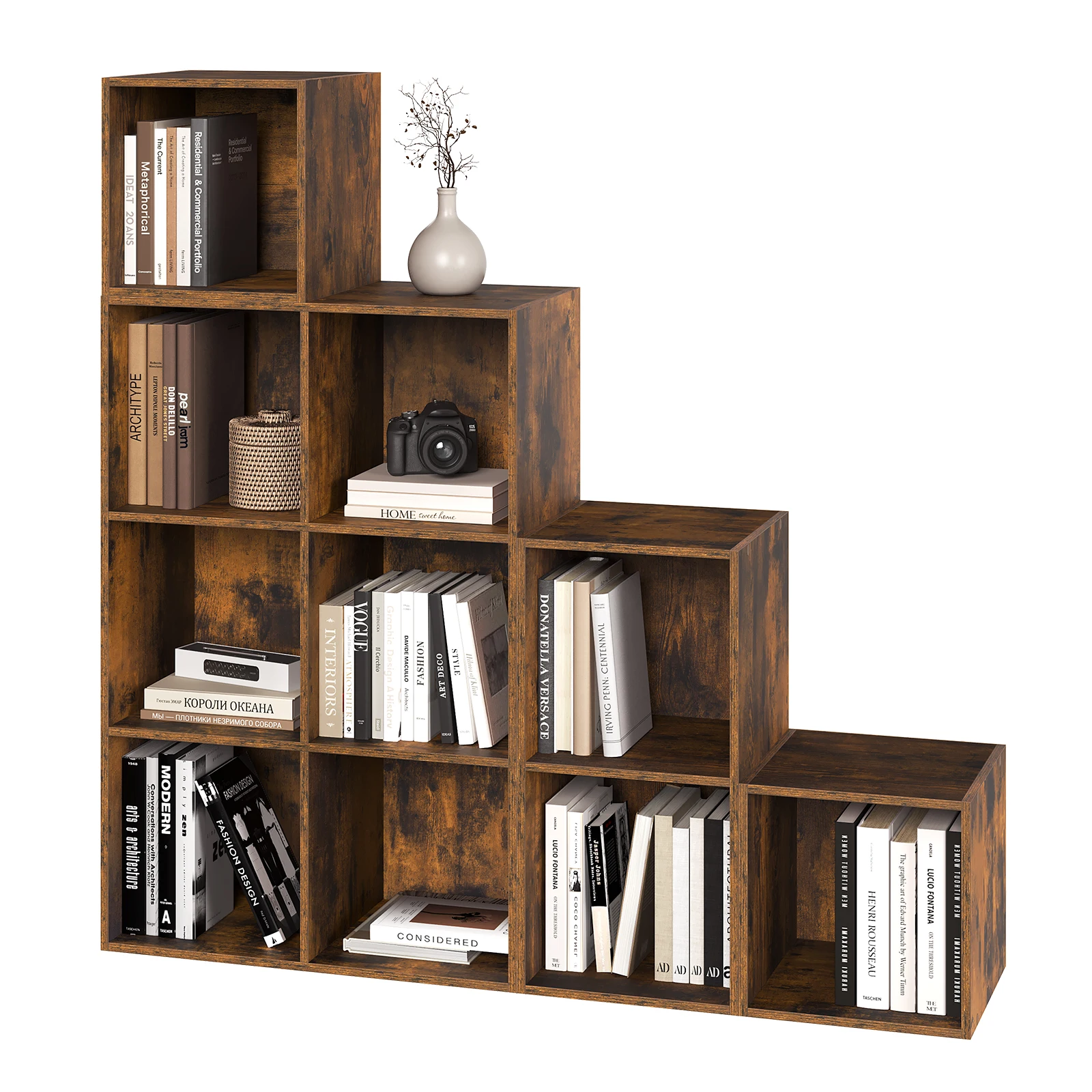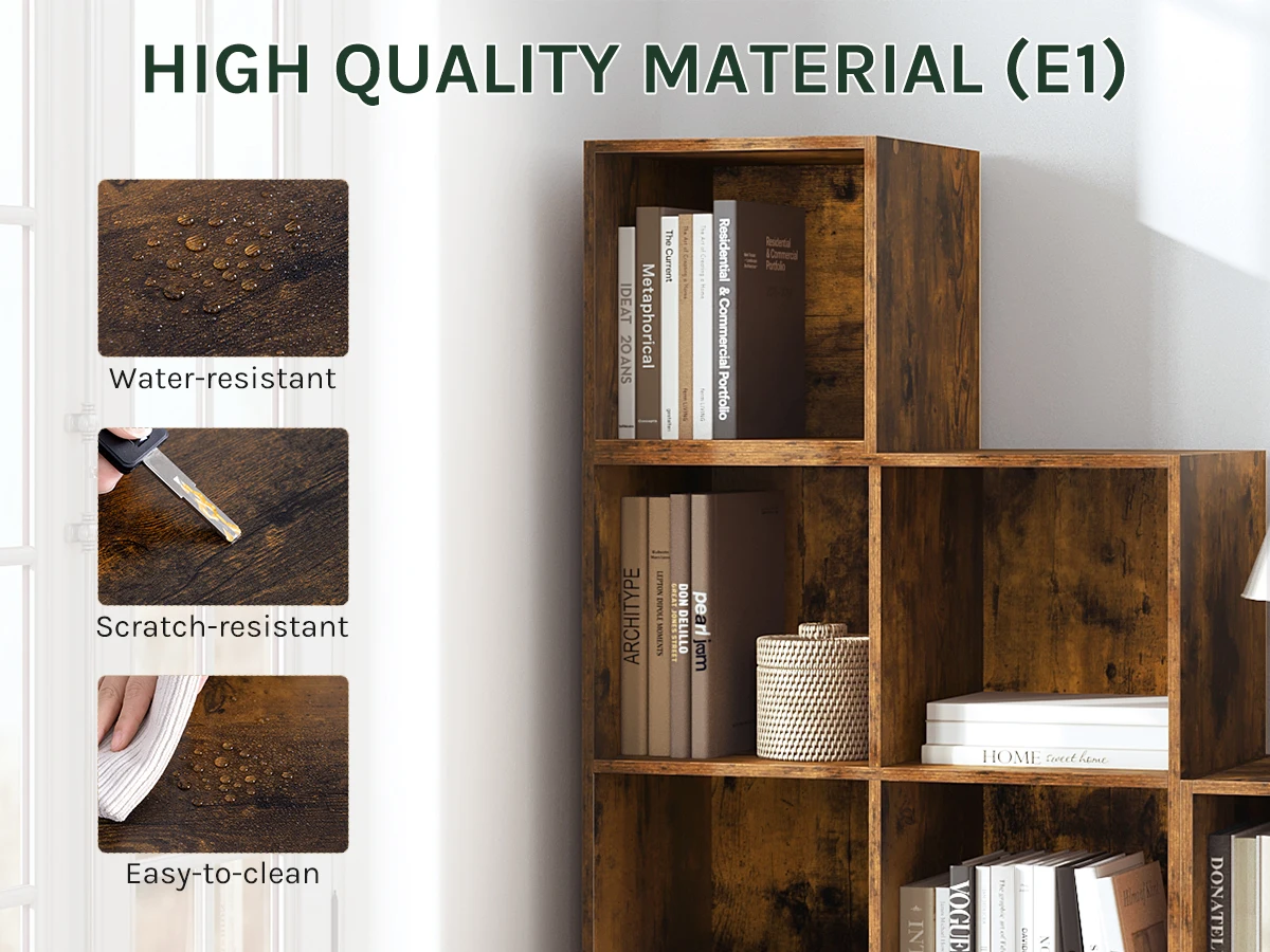 😊Multifunctional and versatile: the stair shelf shows a simple and modern look with a changeable shape. Thanks to the rustic brown, it can be used in the living room, bedroom, office, etc. and can also be used as a room divider