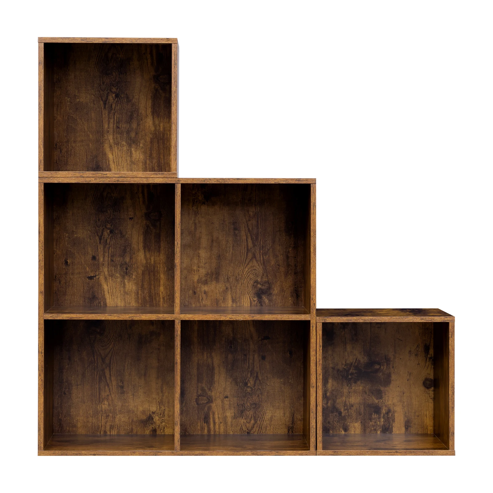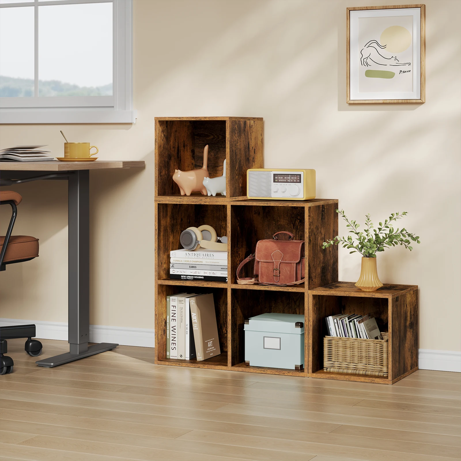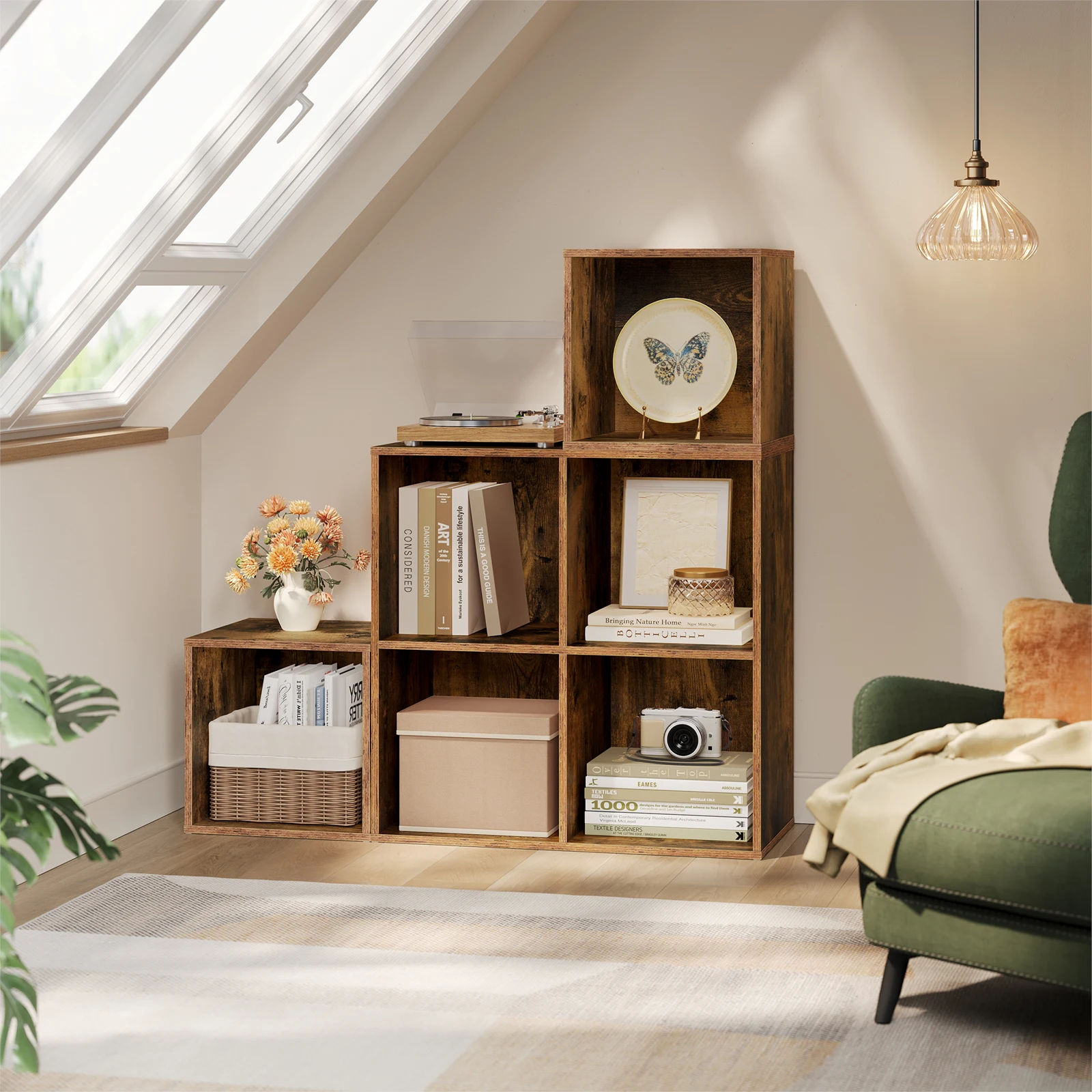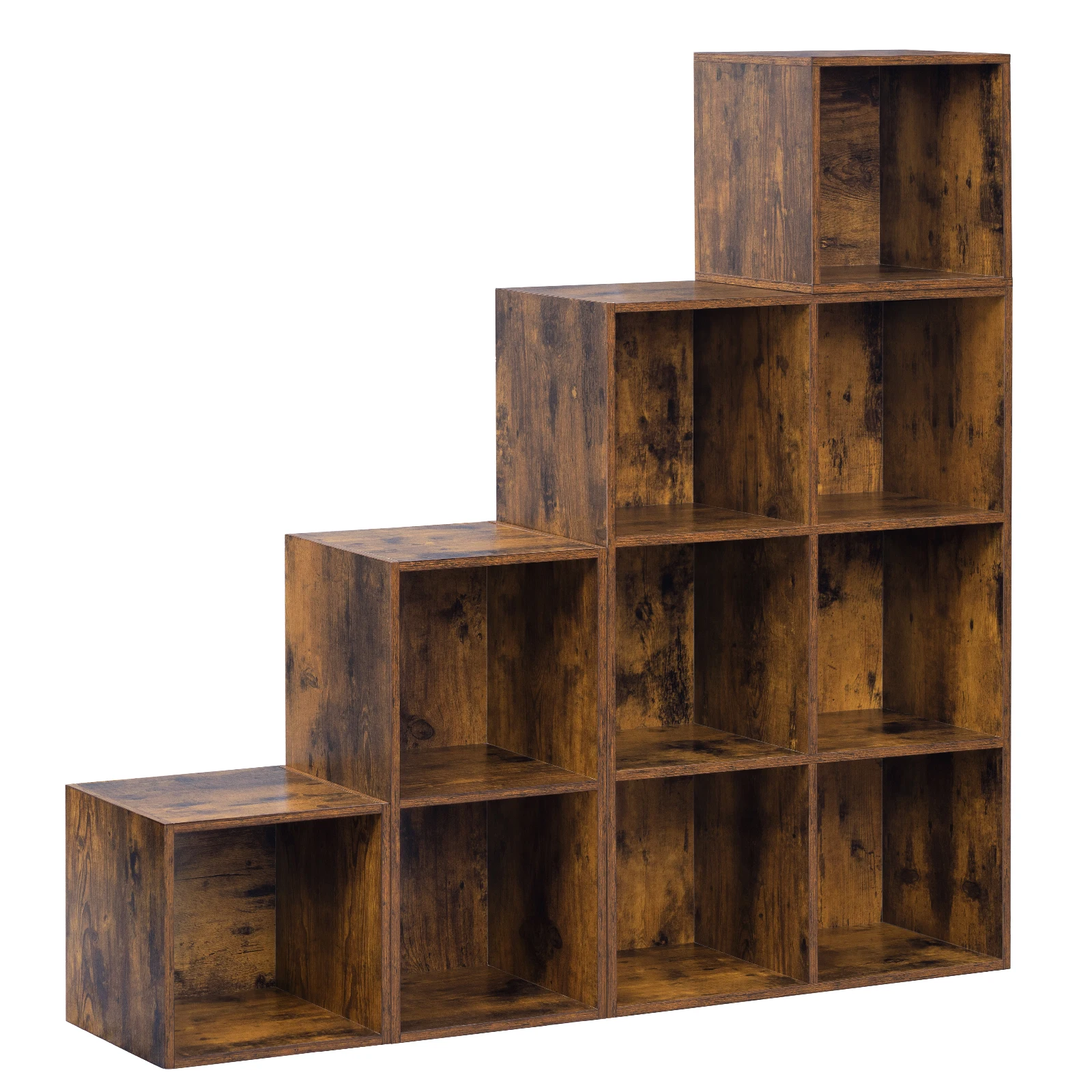 😊Multifunctional and versatile: the stair shelf shows a simple and modern look with a changeable shape. Thanks to the rustic brown, it can be used in the living room, bedroom, office, etc. and can also be used as a room divider