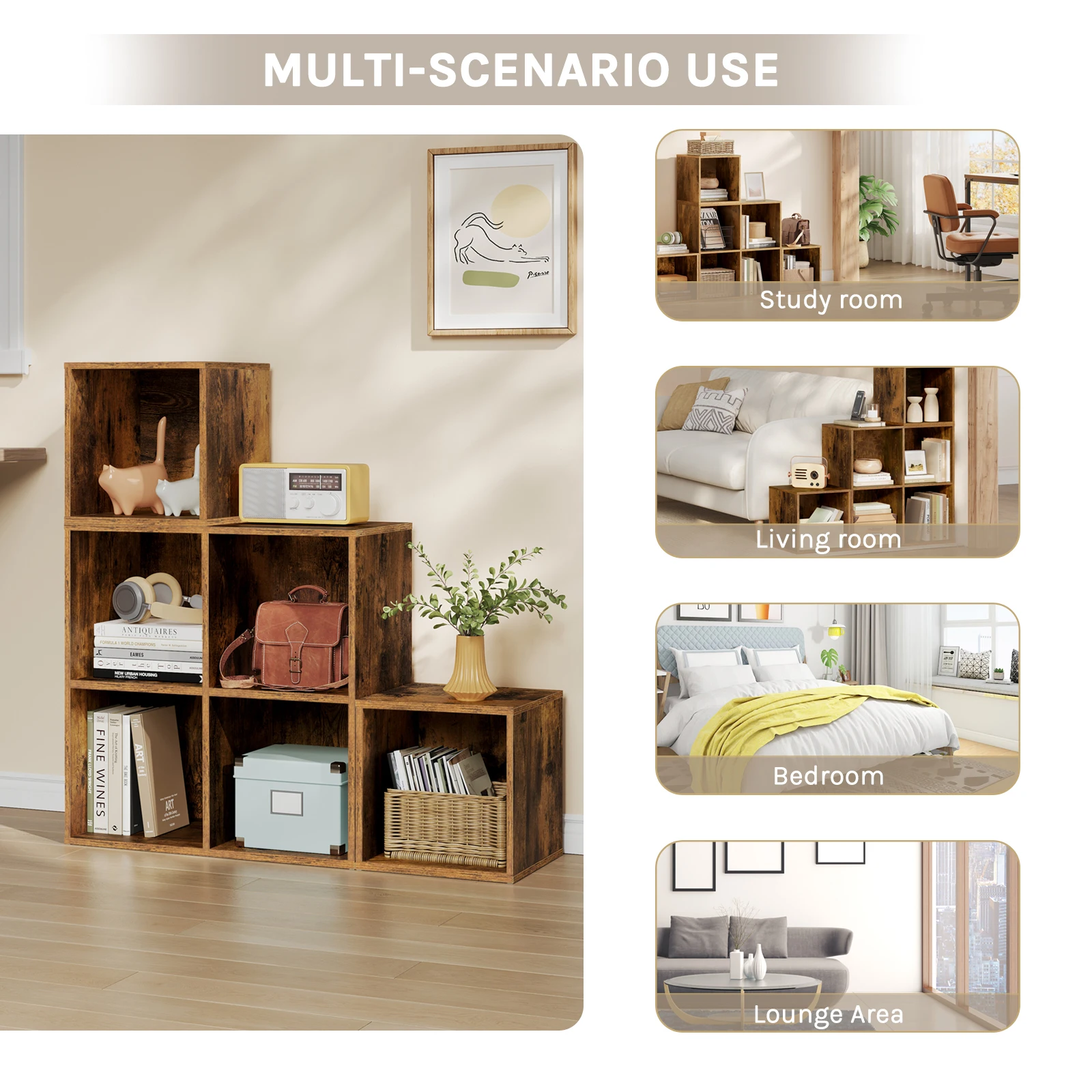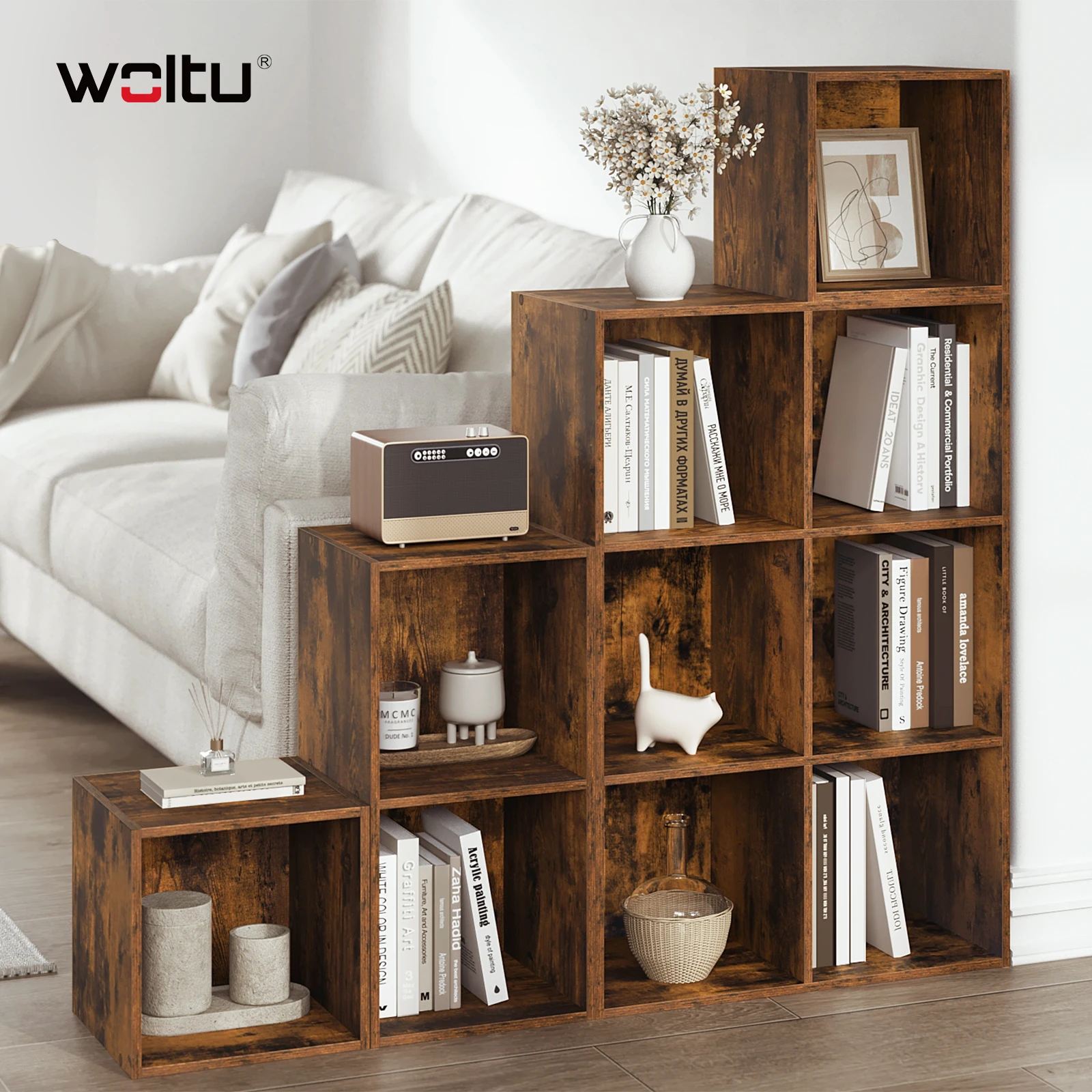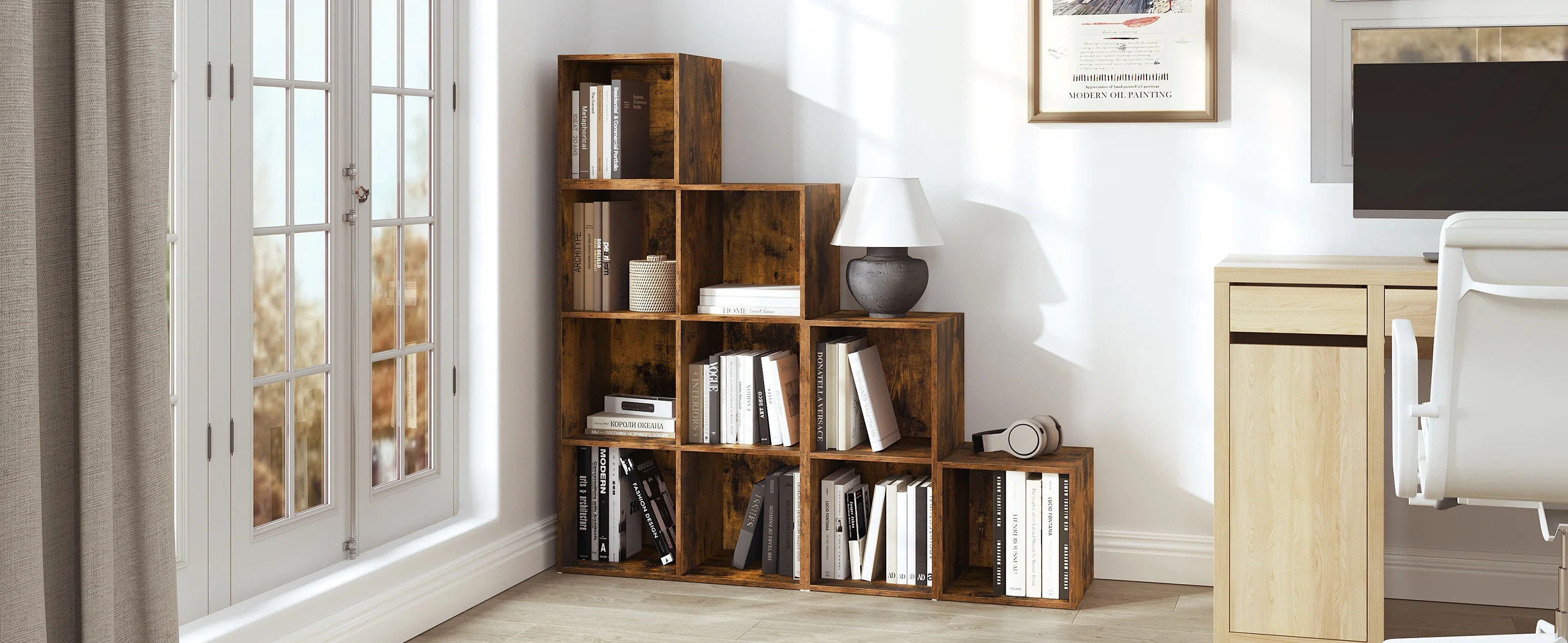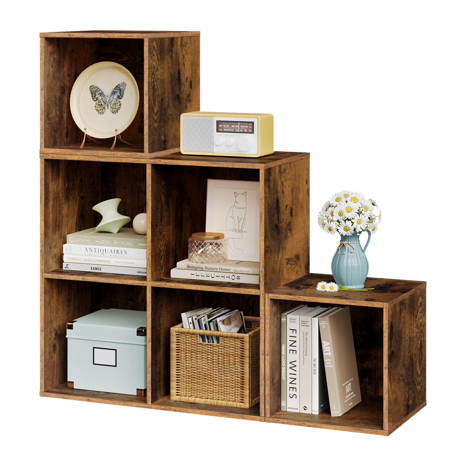 😊Multifunctional and versatile: the stair shelf shows a simple and modern look with a changeable shape. Thanks to the rustic brown, it can be used in the living room, bedroom, office, etc. and can also be used as a room divider