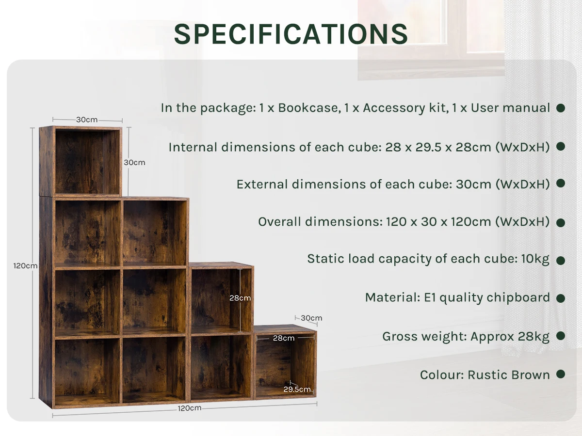 😊 DIY bookcase: 1 cabinet with 6 cubes + 1 cabinet with 2 cubes + 2 separate cubes. You can combine them to get the shape you want. Outer size: 30x30x30cm/cube 10 cubes offer plenty of space for different items