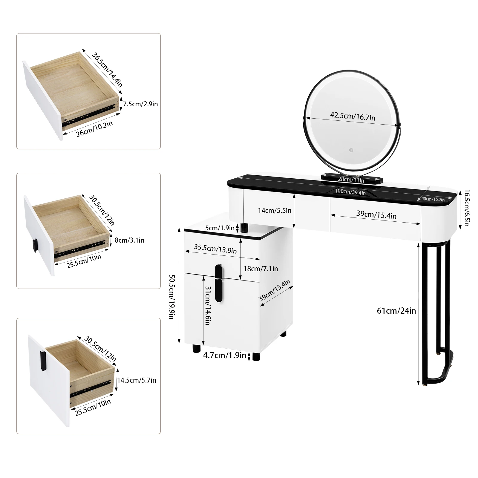 • LARGE SPACE: The dressing table with storage has 1 tempered glass top measuring 100x40 cm, 2 drawers and 1 chest of drawers with 2 drawers of different sizes so that your skincare products, cosmetics and jewelry can be classified and stored for easy access