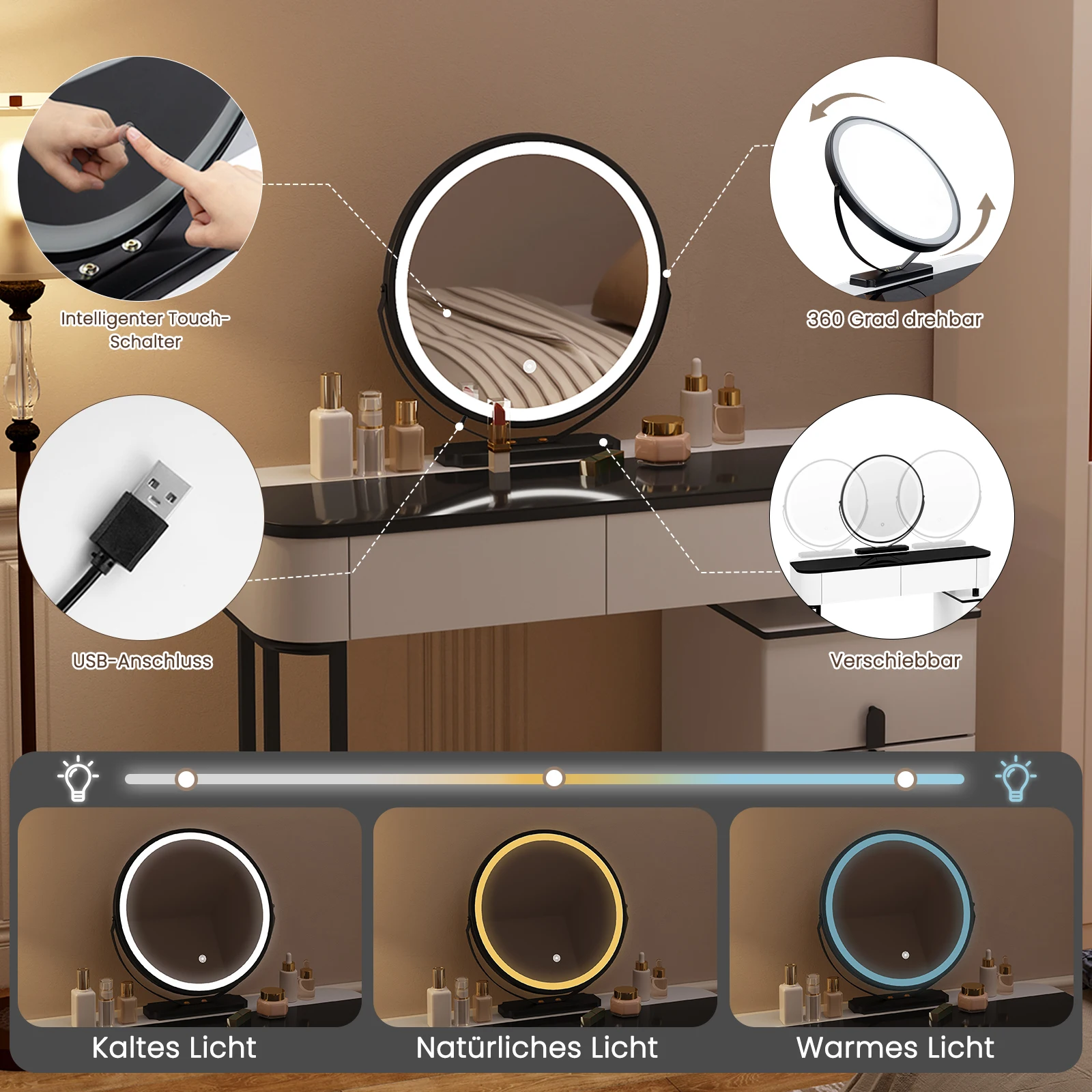 • LED MIRROR WITH ADJUSTABLE LIGHTING: The round mirror (Ф-45 cm) has a LED strip powered by USB port, CE and RoHS certified. It is touch adjustable in 3 color temperatures, movable and 360° rotatable for flexible use