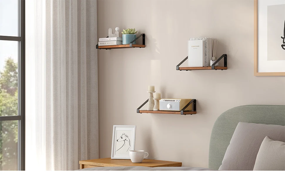 2. CREATE A VINTAGE-ATMOSPH & Auml;RE:Put pretty accessories on these appealing hover shelves to leave them with the lead role. The combination of a dark brown shelf and black bracket also gives your four walls a unique vintage touch