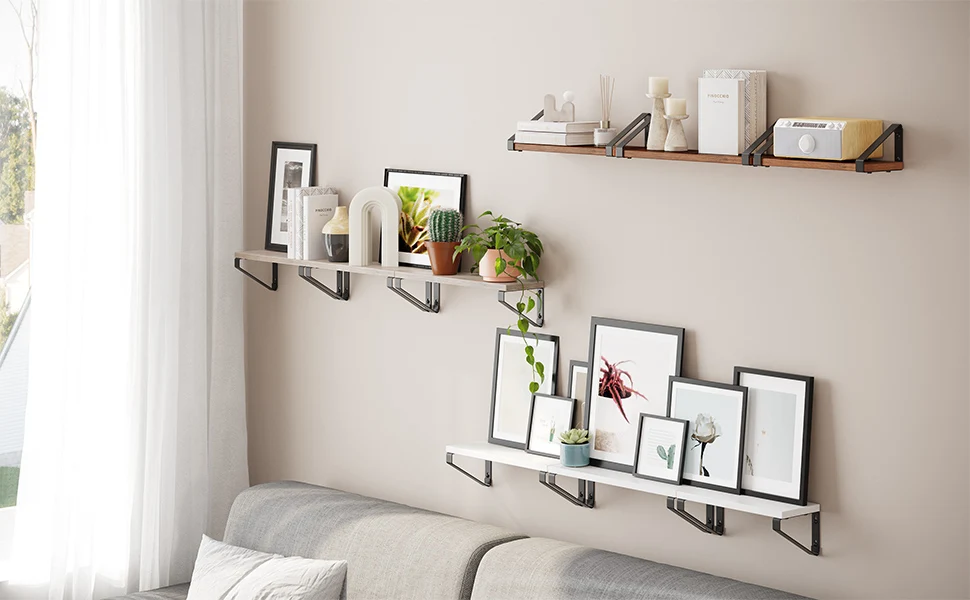 There's not enough space on your floor to put a narrow shelf there? So where do your decorative items, picture frame, collections or spices go? Look at your walls! Use these 3 dark brown hover shelves in the living room to present your family photos, in the bathroom to stow soap and other toiletries, or in the kitchen to place spices on top.