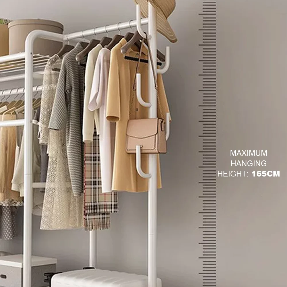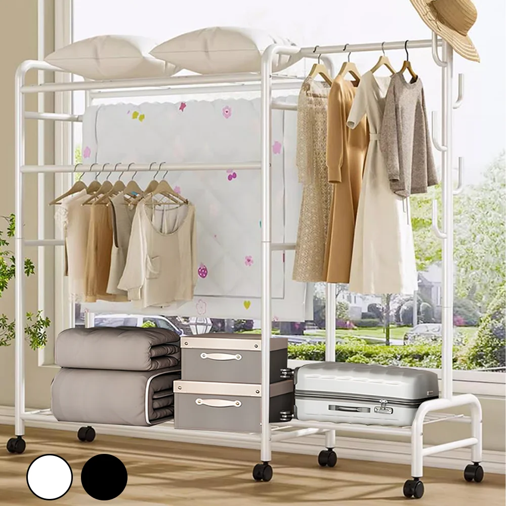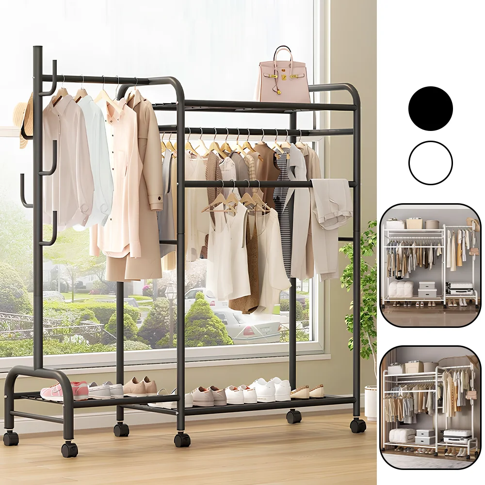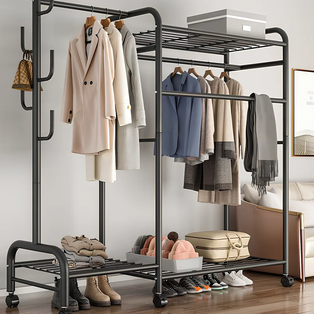 Clothes Rack Heavy Duty Coat Shelf Double-Rod Hats Clothes Rack With Hooks Hanging Clothe Organizer Floor Hangers Organizer