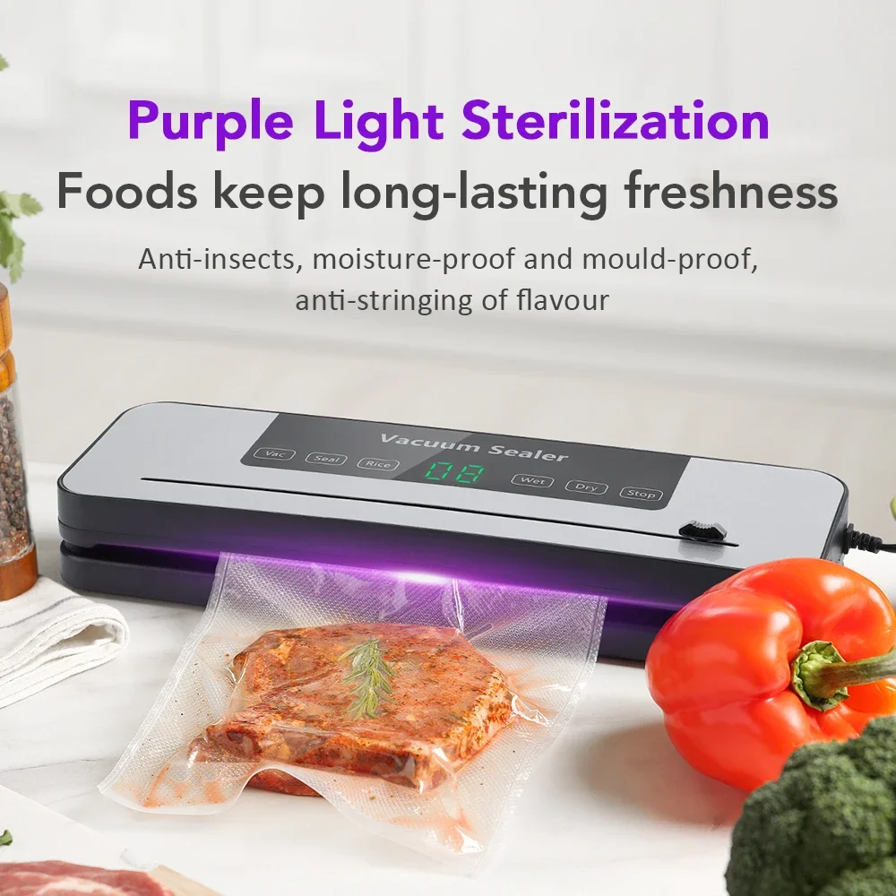 3. The automatic food sealer comes with a UV sterilization function that helps disinfect foods, protecting against insects, moisture, mold, and odors while maintaining vacuum sealing efficiency.