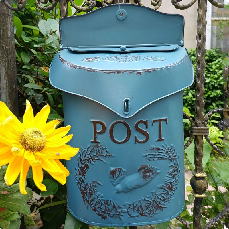 It features a brown rust and TURQUOISE BLUE painted finish — "POST" embossed in the center, a little bird in flight along a floral garland, and topped off with scrollwork on the lid