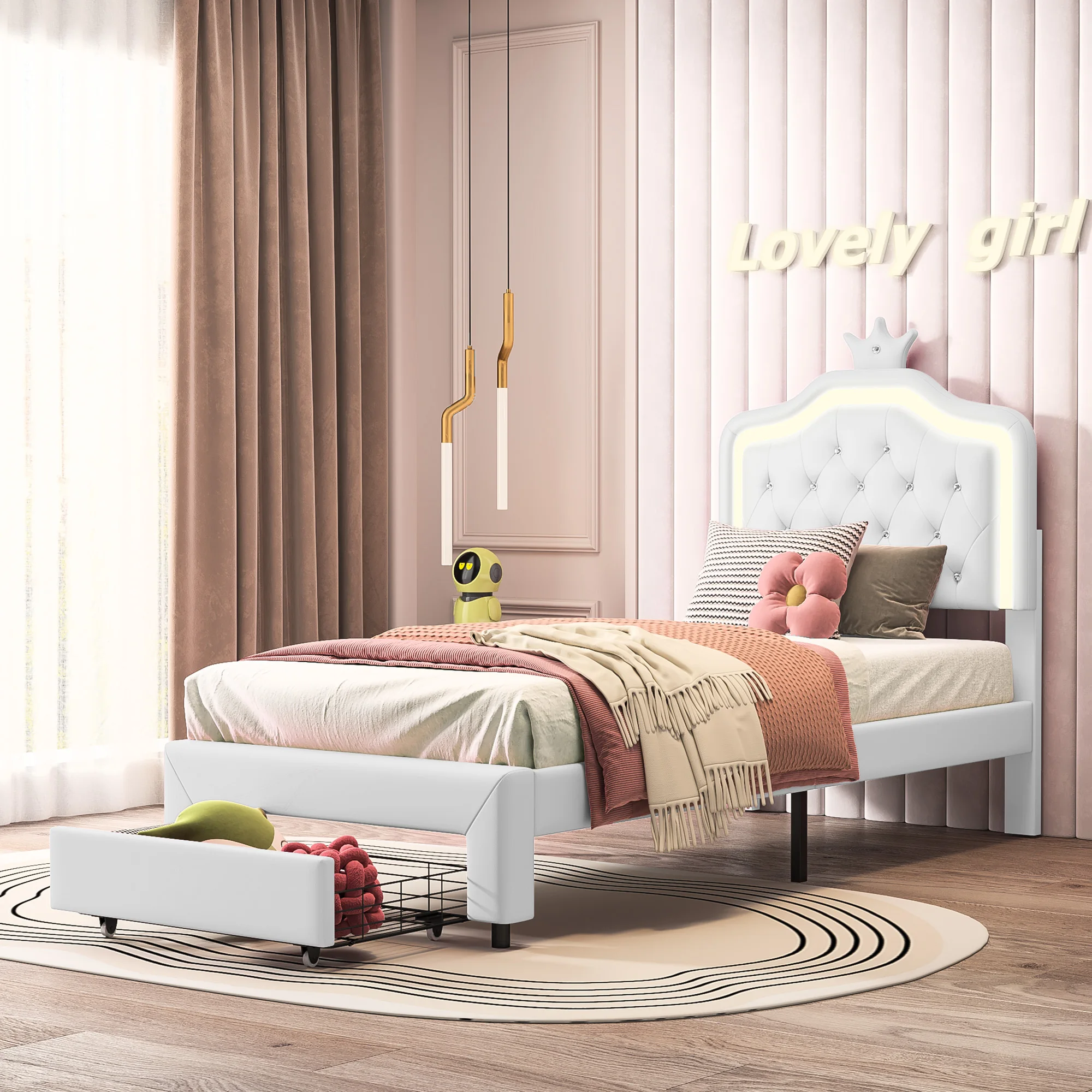 The design is unique: the headboard is topped by a crown. There are drawers at the end of the bed and lights at the head of the bed.