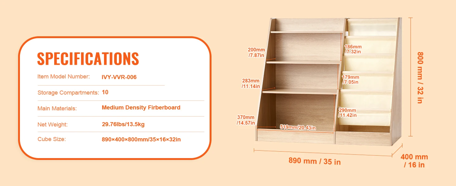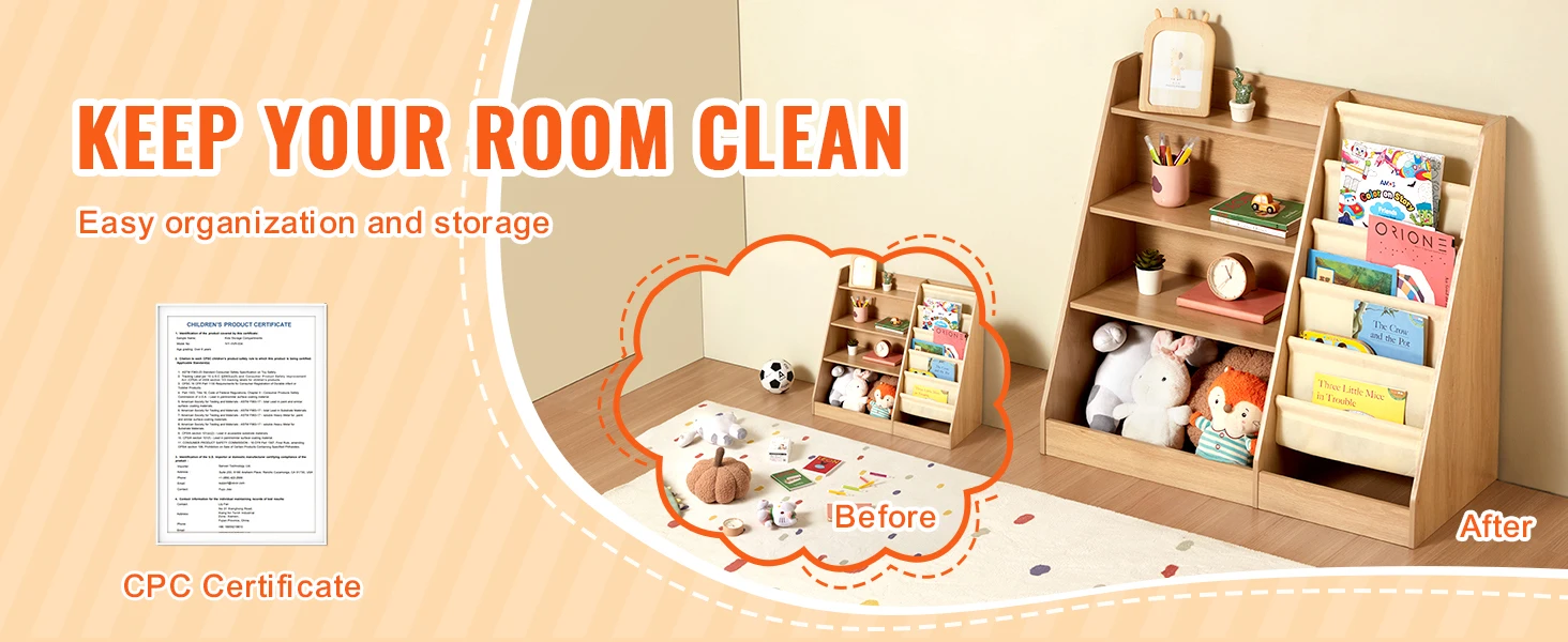 Organized Storage: Start with our kid's wooden bookshelf for a tidy and organized space. Give toys, books, and other items a designated place, making it easy to tidy up and keep life organized.