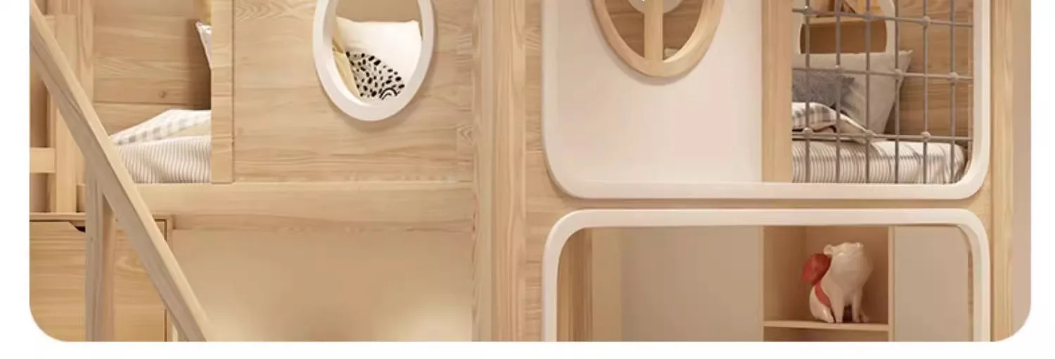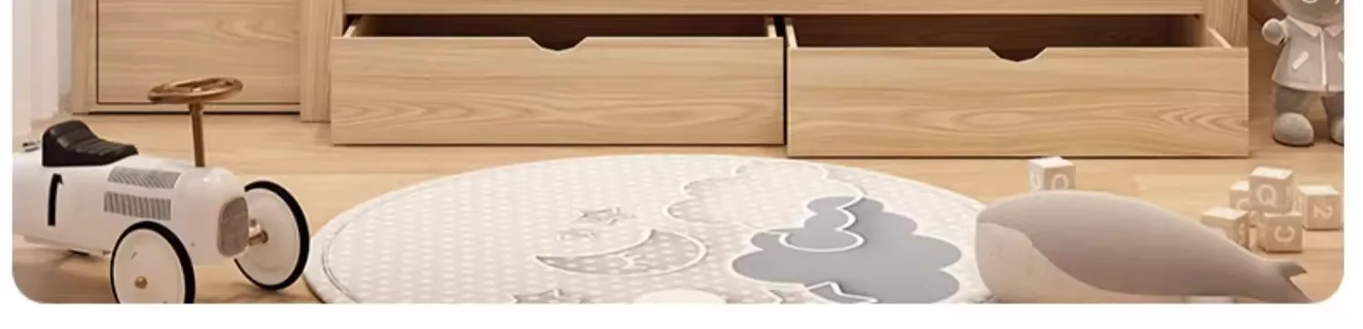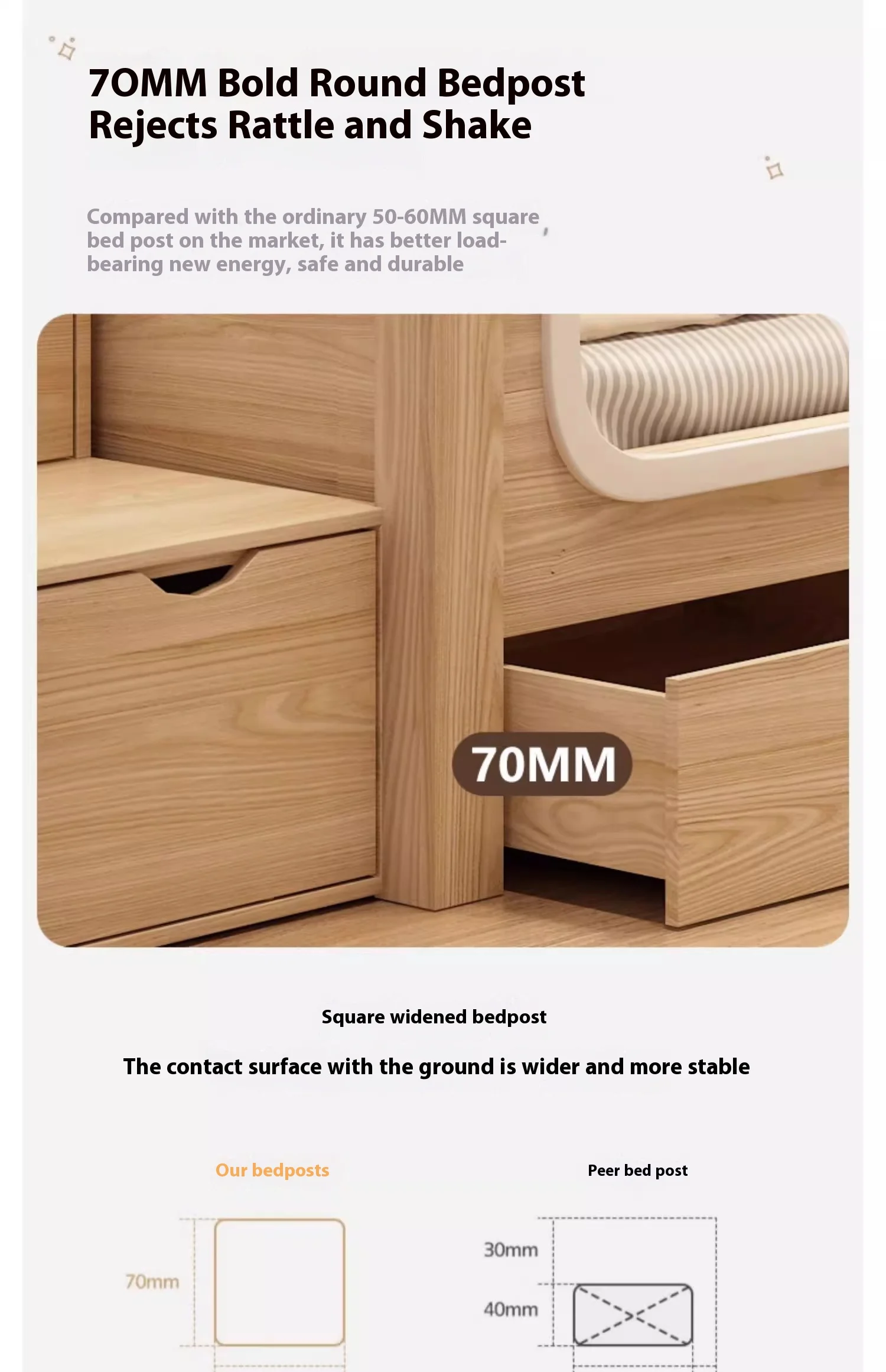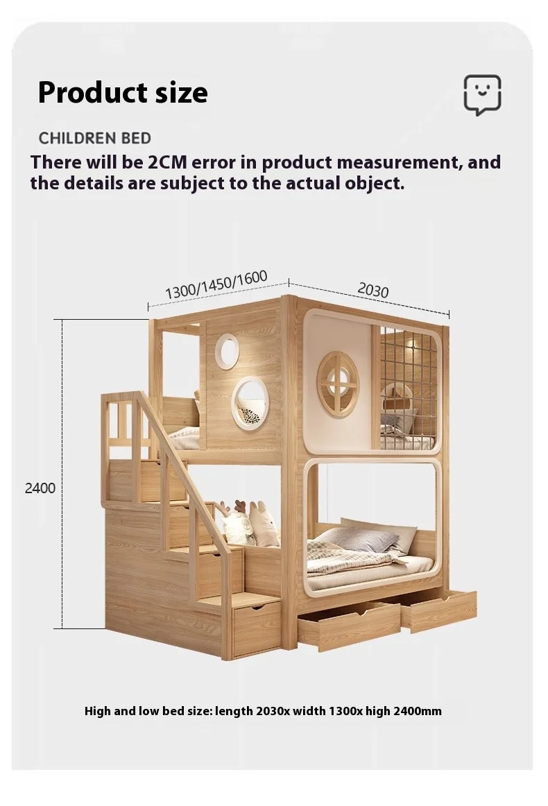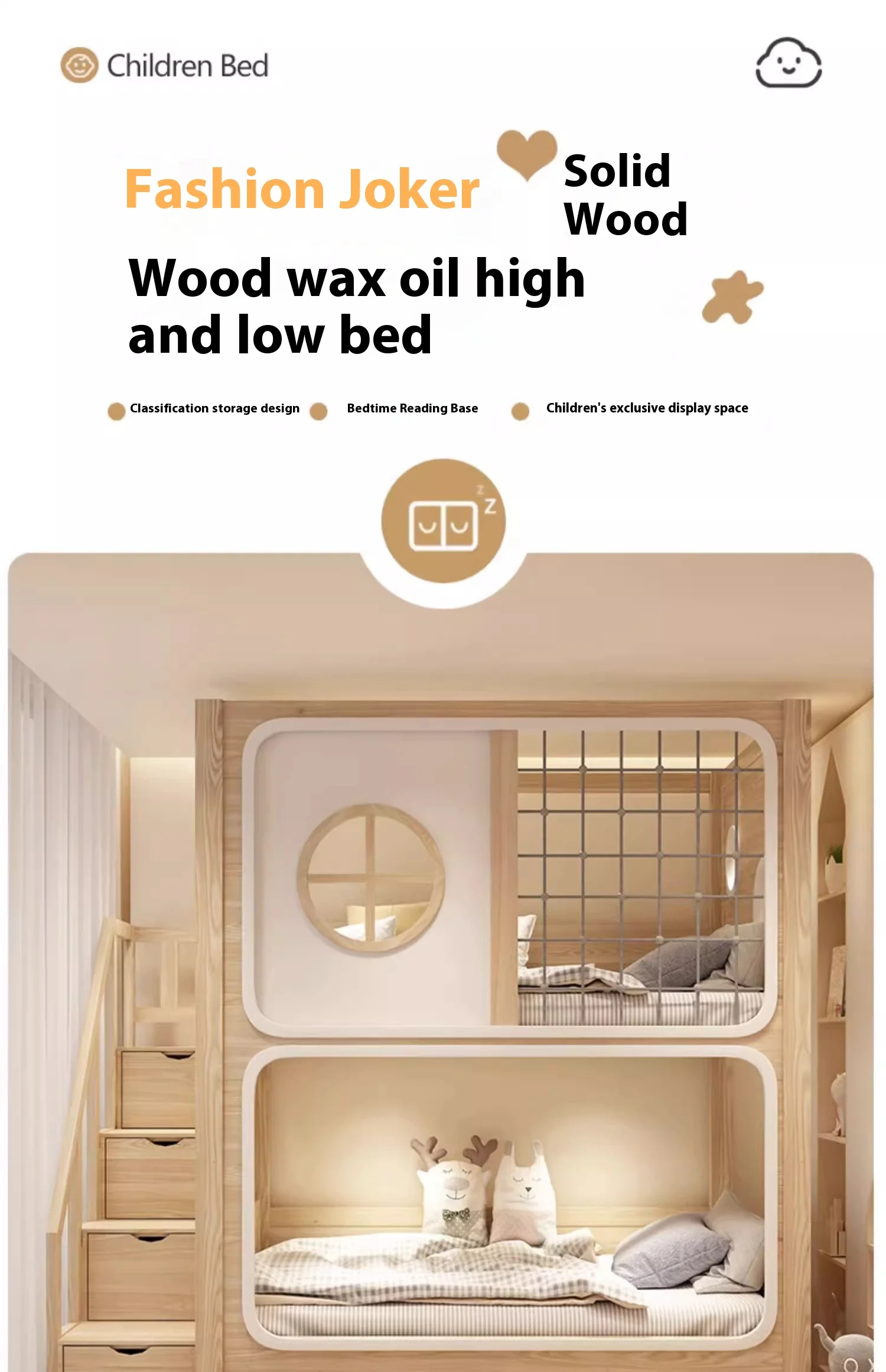 The solid wood white wax children's bed is made of fine texture, clear grain, anti-corrosion, and coated with wood wax oil on the surface to better protect the wood and enhance surface hardness. It is waterproof and stain-resistant. It adopts 70mm thickened bed columns, which have stronger load-bearing capacity, are safe and durable. The guardrail design ensures the safety of children. The corners are polished round to prevent bumps. The staircase can be installed on both sides and can be freely combined.