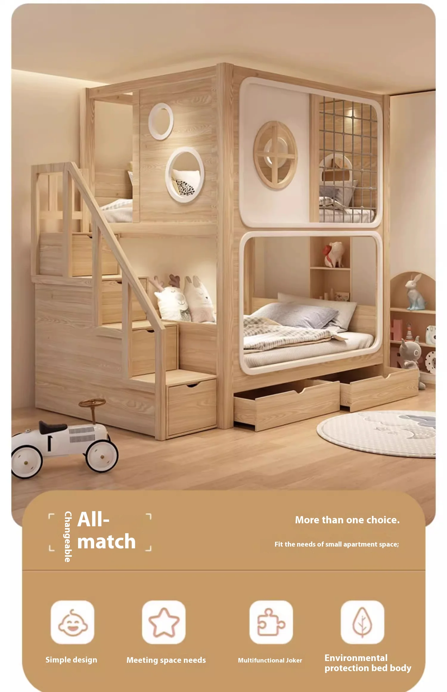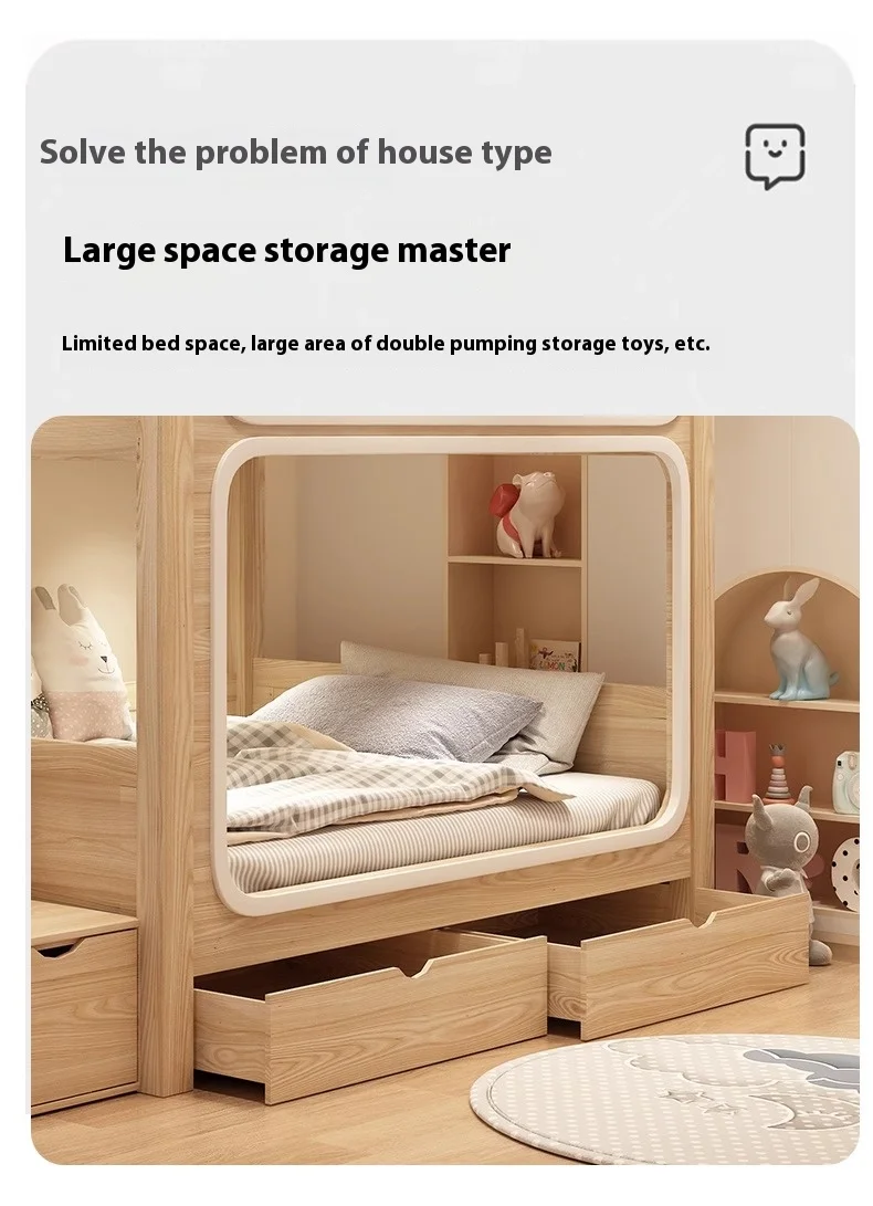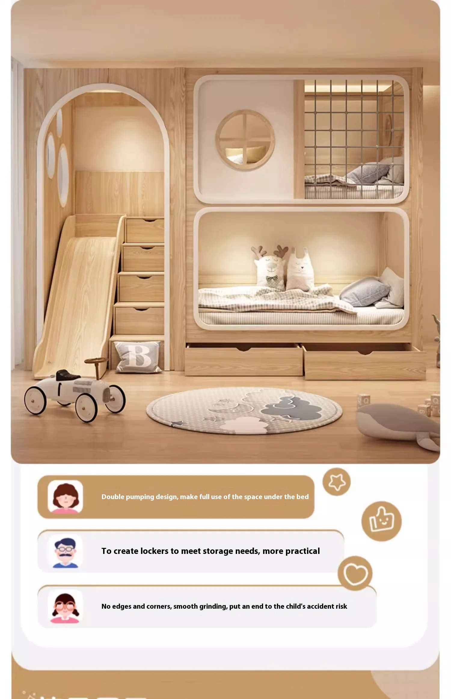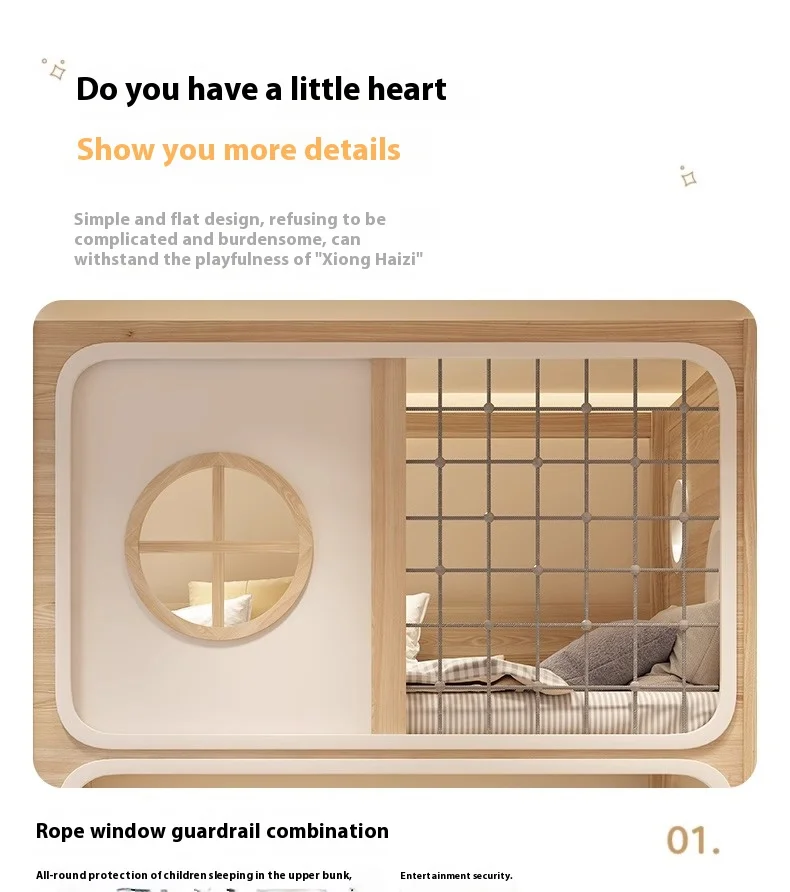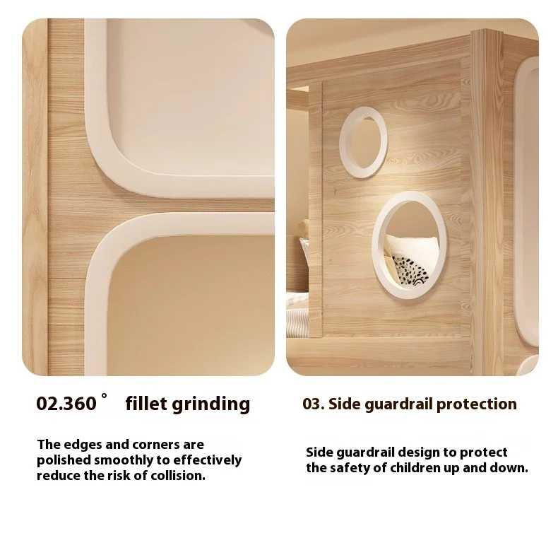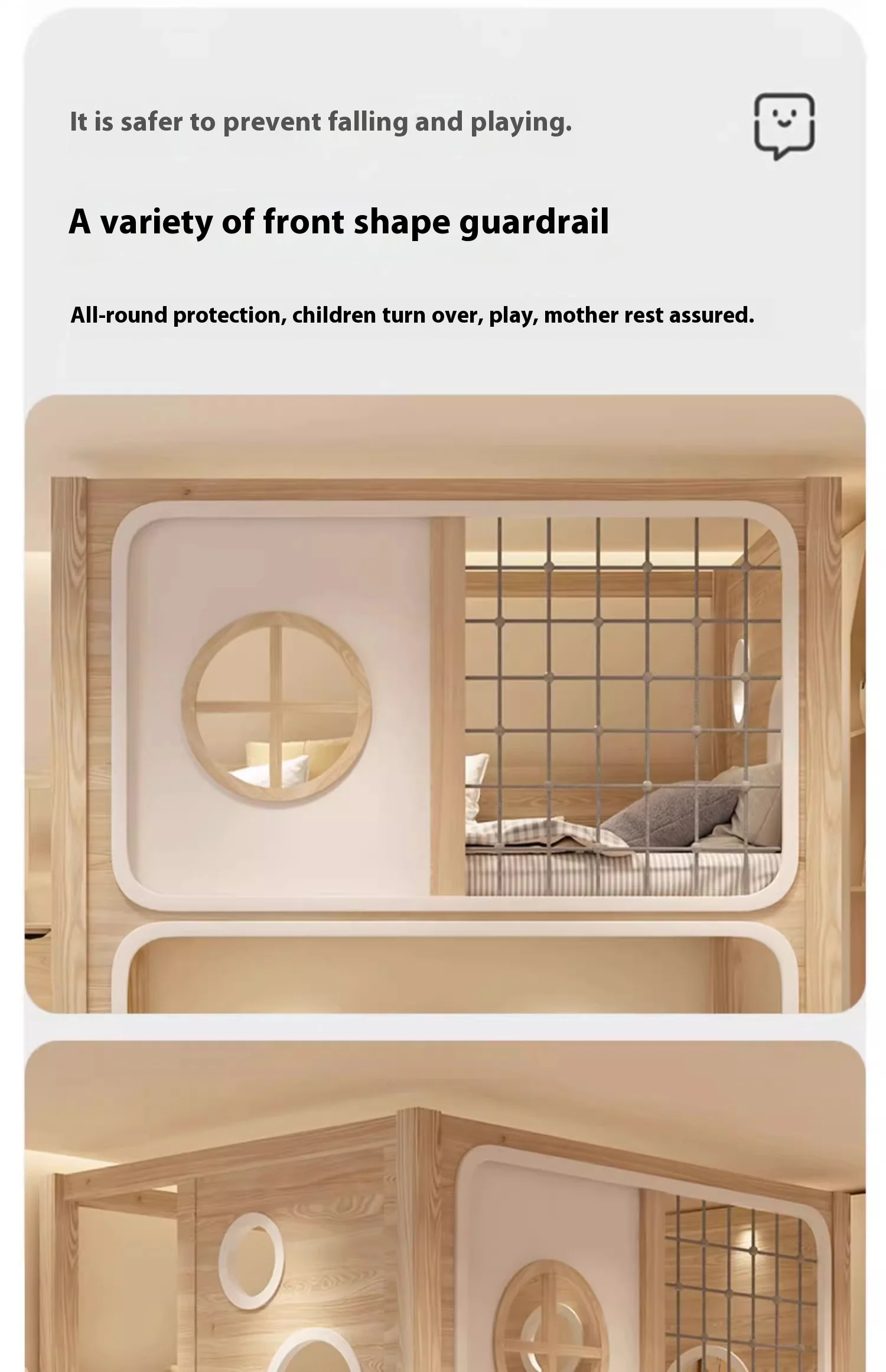 The solid wood white wax children's bed is made of fine texture, clear grain, anti-corrosion, and coated with wood wax oil on the surface to better protect the wood and enhance surface hardness. It is waterproof and stain-resistant. It adopts 70mm thickened bed columns, which have stronger load-bearing capacity, are safe and durable. The guardrail design ensures the safety of children. The corners are polished round to prevent bumps. The staircase can be installed on both sides and can be freely combined.