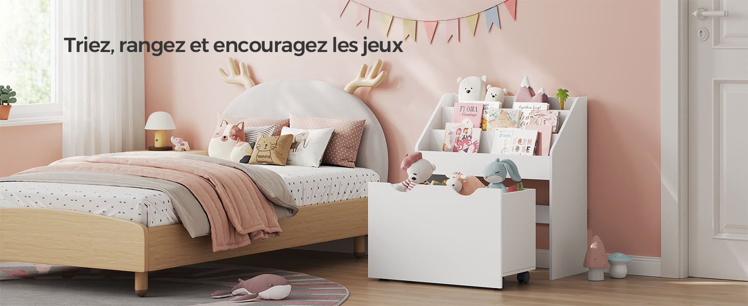 [Pour les livres et les jeux] Voilà 3 compartiments ouverts en haut pour classer des livres de différentes tailles et 1 coffre à jouets avec des roues que votre petit peut sortir pour trouver sa collection de jouets