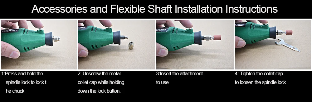 1:Unscrew the plastic nut.2:While holding down the lock button,unscrew the collet.3:Pull out the soft shaft core and connect the chuck.4:Tighten the soft shaft cap.5:Insert the flexible shaft hool into the other and of the flexble shaft,lock the flexible shaft.6:Insert the attachment to be installed and tighten the collet nut.