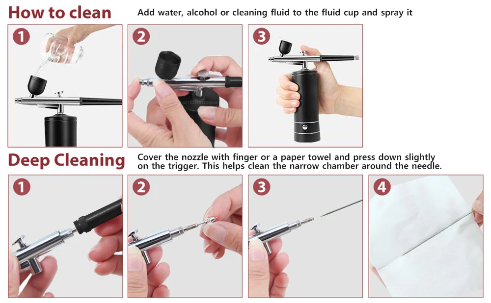 Note: All paints must be diluted ! When spraying is finished, please use the cleaning brush to thoroughly clean the airbrush cavity, nozzle, and liquid cup in time. as thick paint may clog the airbrush machine.