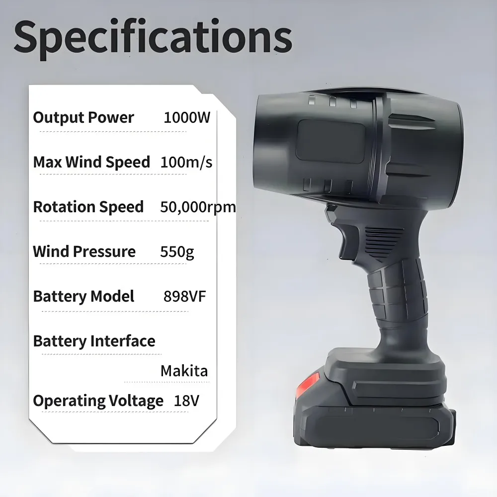 Equipped with a high-performance 1000W motor, this turbo blower delivers an impressive wind speed of 100m/s and up to 50,000 RPM. Its 550g thrust ensures fast, effective cleaning and drying for a wide range of applications.