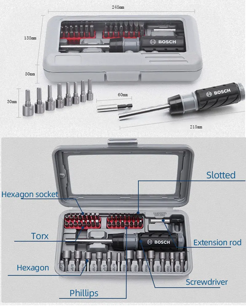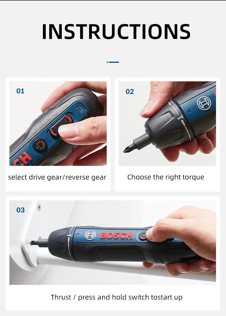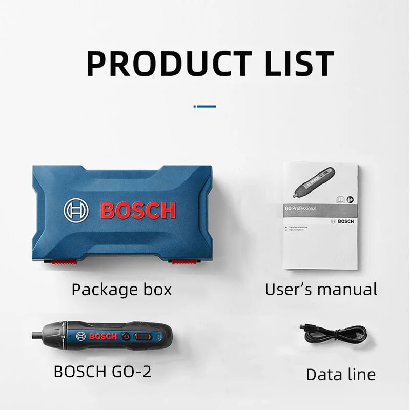 【Bosch go 2 Package Including】:1x 7.15 x 1.57 x 1.57 inch Bosch Power Screwdriver , 1x USB charging cable (Without the adapter) , 1x Instructions , 1x Box.(Other accessories as shown on the options)