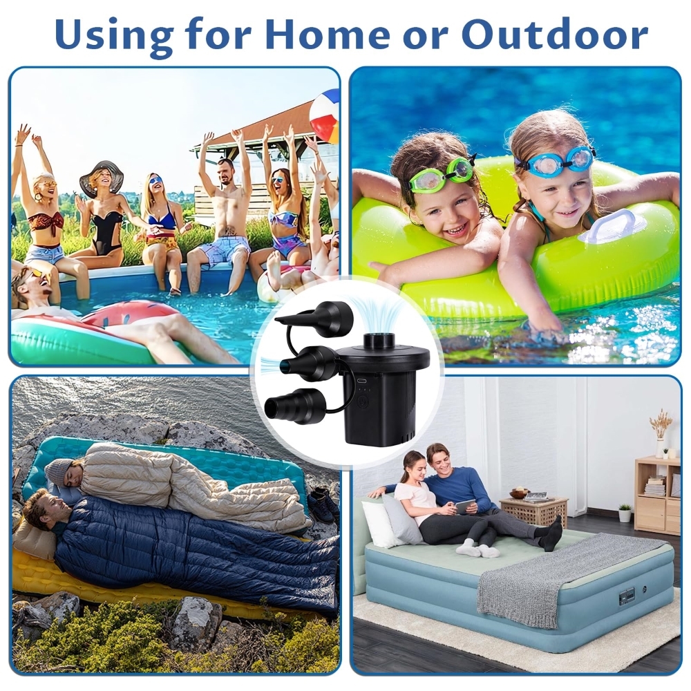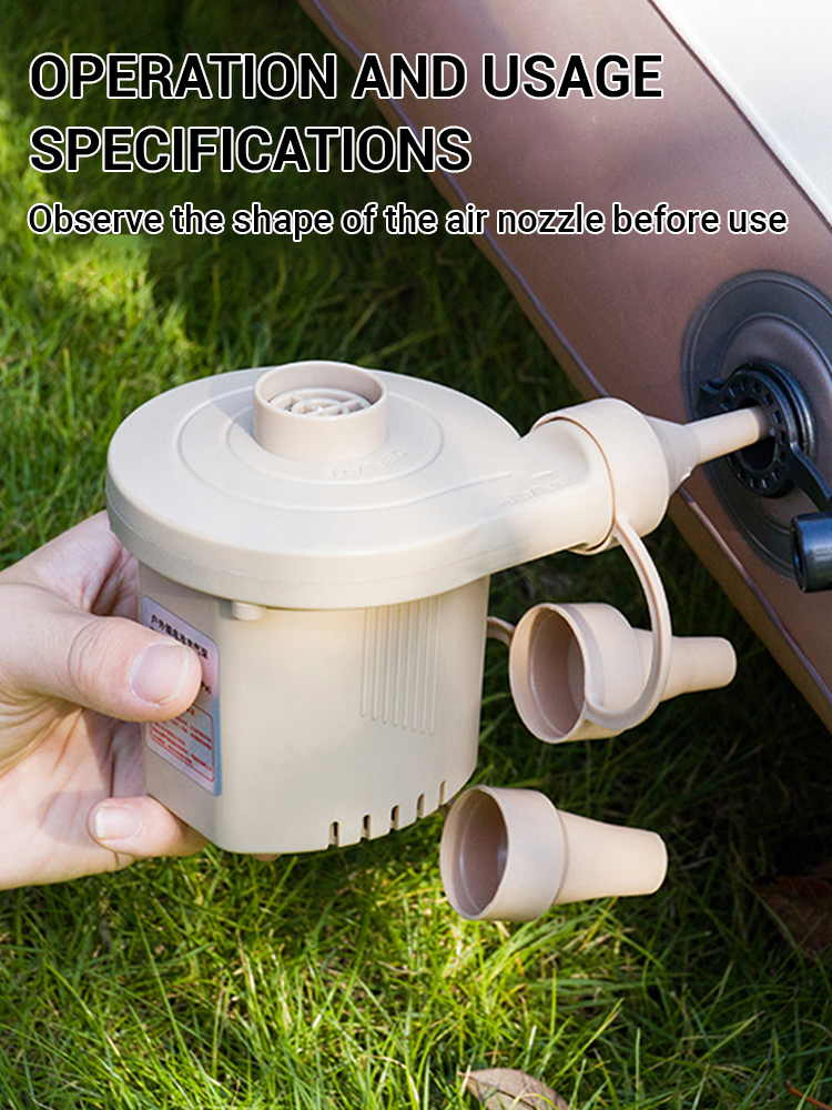 3 nozzles to choose from: with 3 nozzles to choose from, fits most inflatable products that need to be inflated or ventilated. Our quick inflation device is suitable for most different types of ventilated products, such as air mattress, inflatable sofa, air filled toys, inflatable pool, swimming wheels, etc.