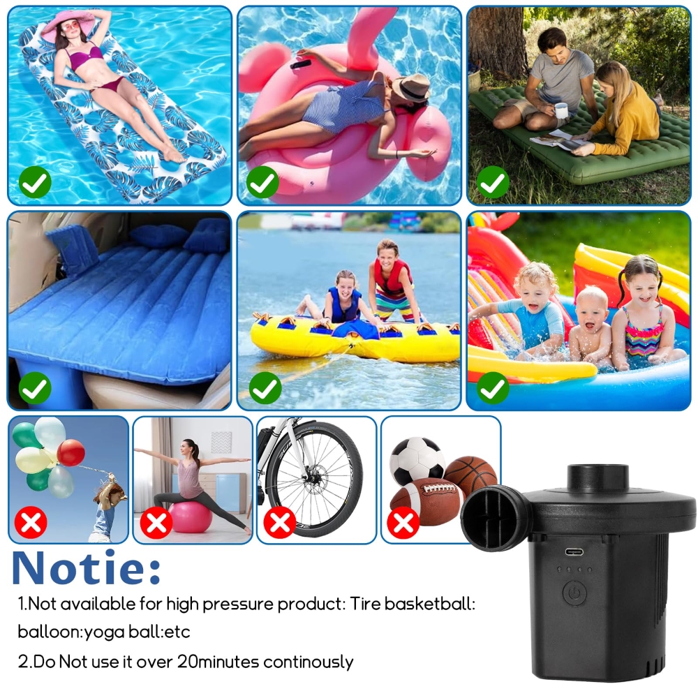 💚【Universal Application】Electric air pump with inflatable mattresses, shower trays, water beds, swimming wheels, beach toys or other inflatable toys. Tip: Not suitable for needle valve products, such as balloons, basketball, birth balls/yoga.