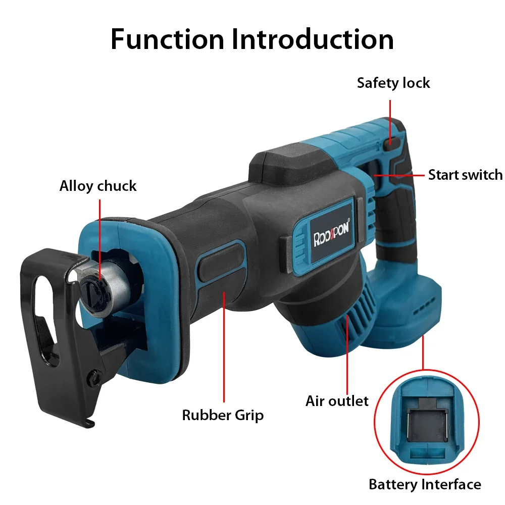 4、Feature - The reciprocating saw has an ergonomic design of the handle, which can provide a comfortable and good grip without slipping. Compact in size and lightweight, it is portable and can be carried anywhere without hand fatigue