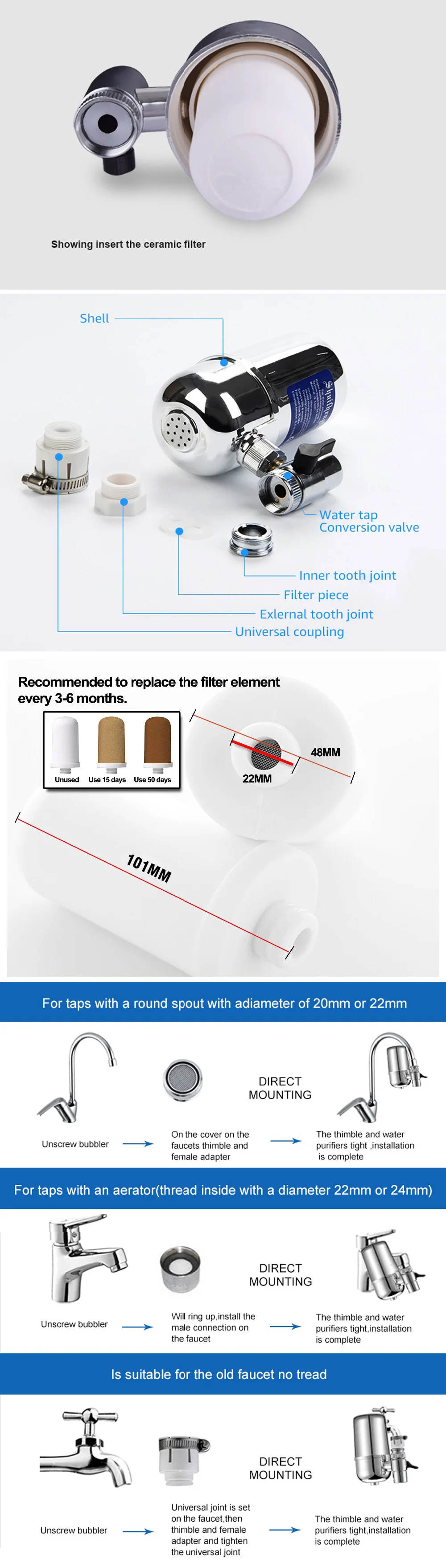 3.Filter can be cleaned and easy to install,Quick fit tap adapter,easy installation on almost any type of tap with screw thread.