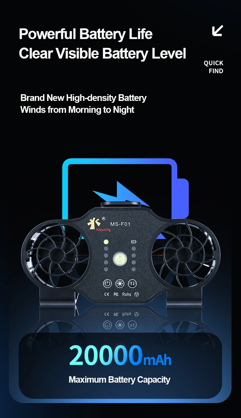 ▪20000mAh 4-Speed Personal Cooling Fan : Delivers cooling from gentle breeze (18ft/s) to super strong wind (29ft/s) with 7.5-12h lasting. Engineered for all-day heat relief for landscaping, delivery, traveller fits on belts, backpacks, or toolkits.