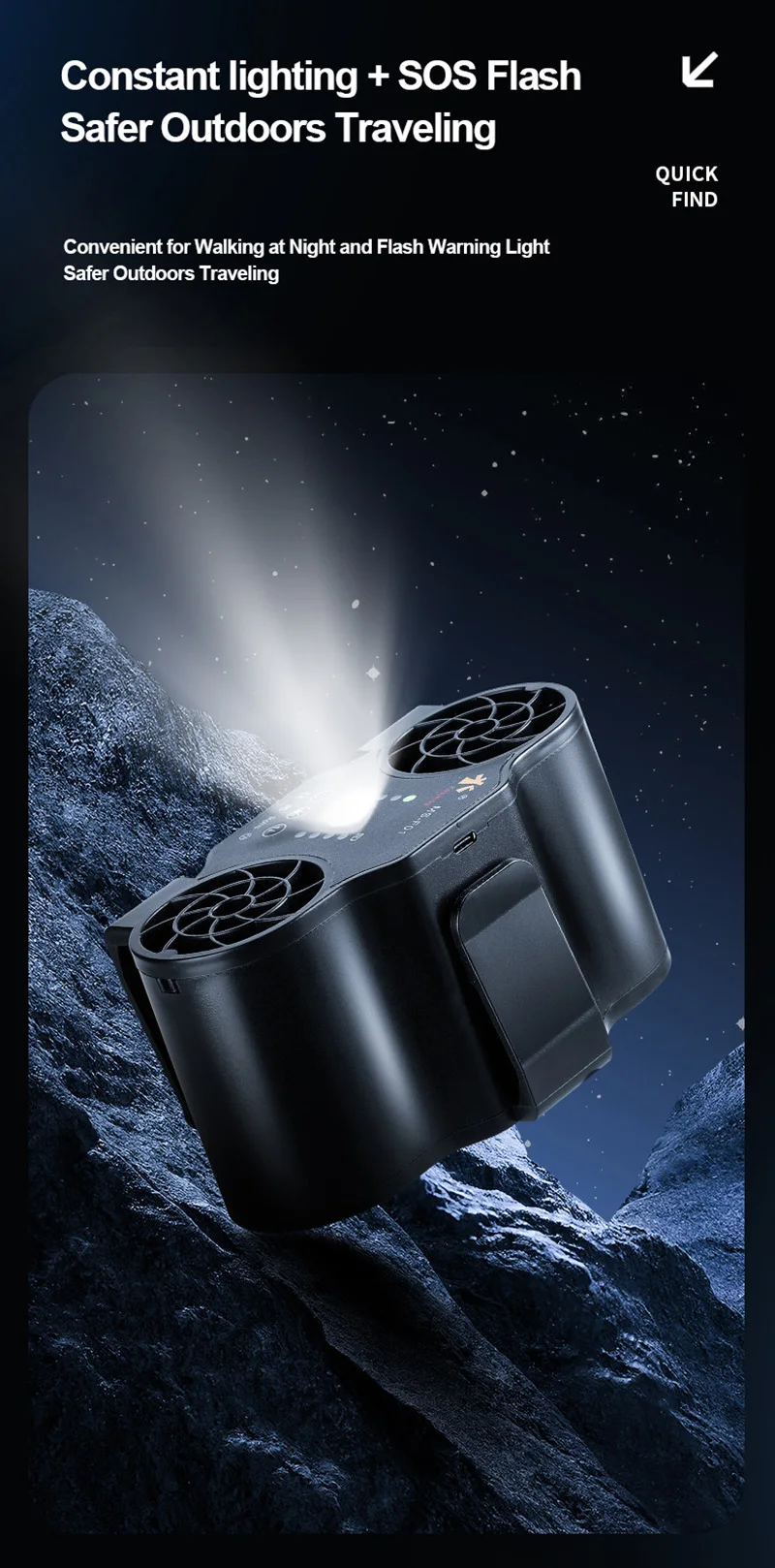 ▪Outdoor Portable Fan with LED: Combines dual airflow and LED (Lights and SOS) in one rugged build. Operate fan and light simultaneously to illuminate trails, campsites, emergency while blowing cold air, perfect for fishing, hiking, blackout preparedness.