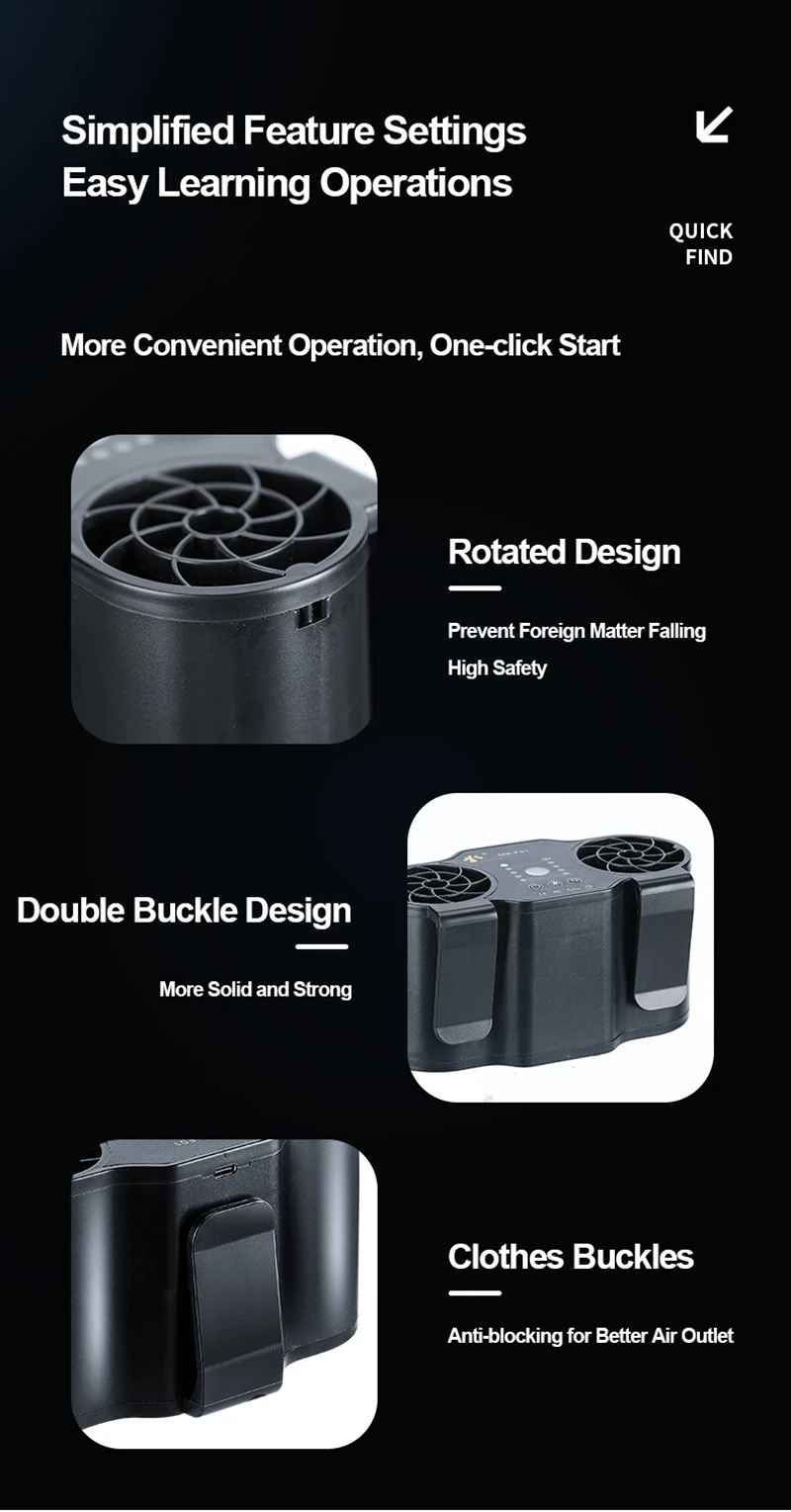 ▪Portable Body Fan with Reversible Airflow: Instantly switch between upward (cool chest face back) and downward airflow (cool legs feet) via one-touch. Perfect solution for beating heatwaves from head to toe for outdoor workers,adventures, or daily use.