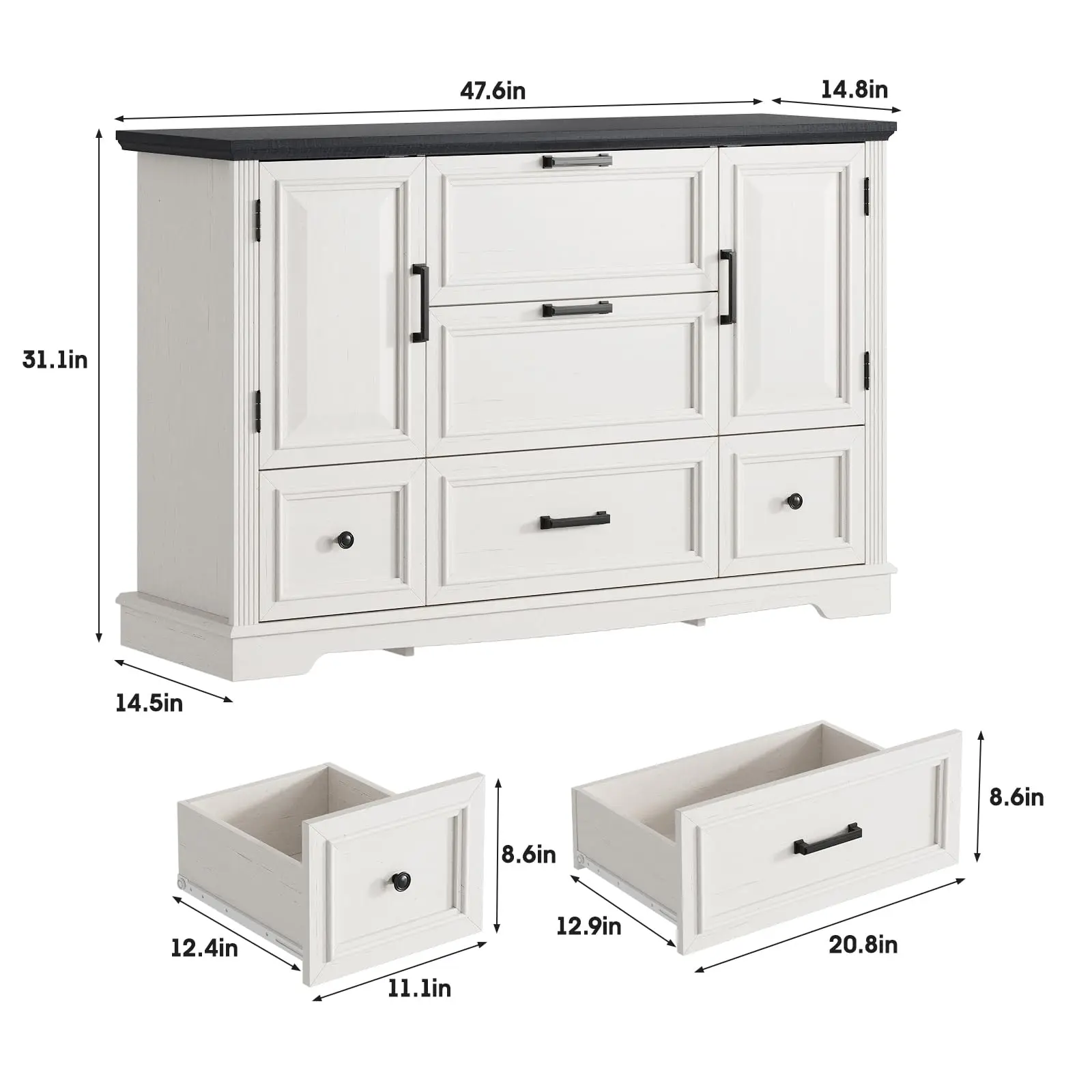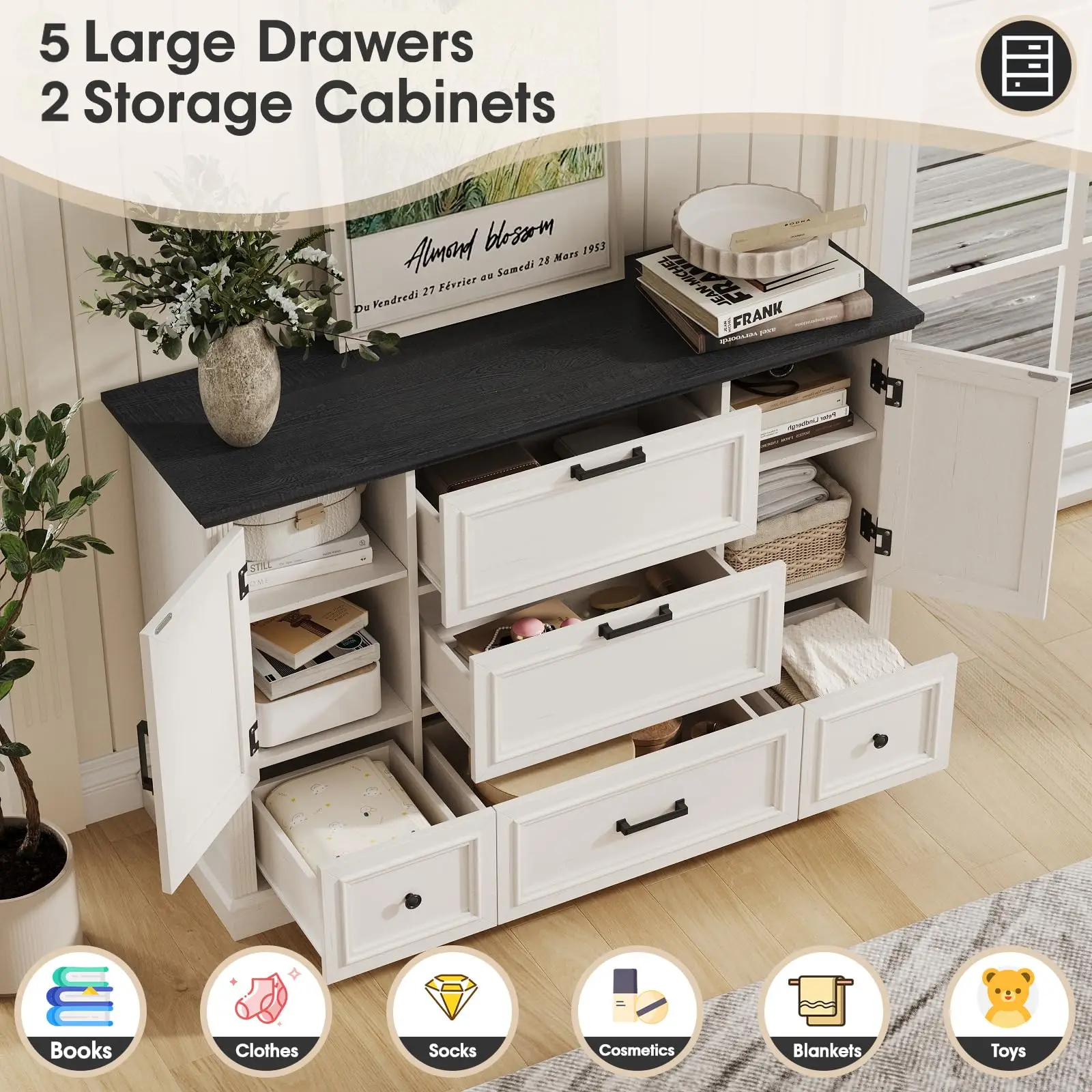 This dresser storage organizer comes with 2 small drawers(each size of the drawer is:11.1''(L)×12.4''(W)×8.6''(H)),3 large drawers(each size of the drawer is:20.8''(L)×12.9''(W)×8.6''(H)), it provide sufficient space for organizing your clothes, shoes, accessories, towels, blankets and other daily necessities.The top of the wooden dresser is also great for keeping the most-used items( such as: books,alarm clock,toys,potted plants,table lamp,ect.) within your reach. With plentiful space to organize, letting your room will always be kept in perfect order
