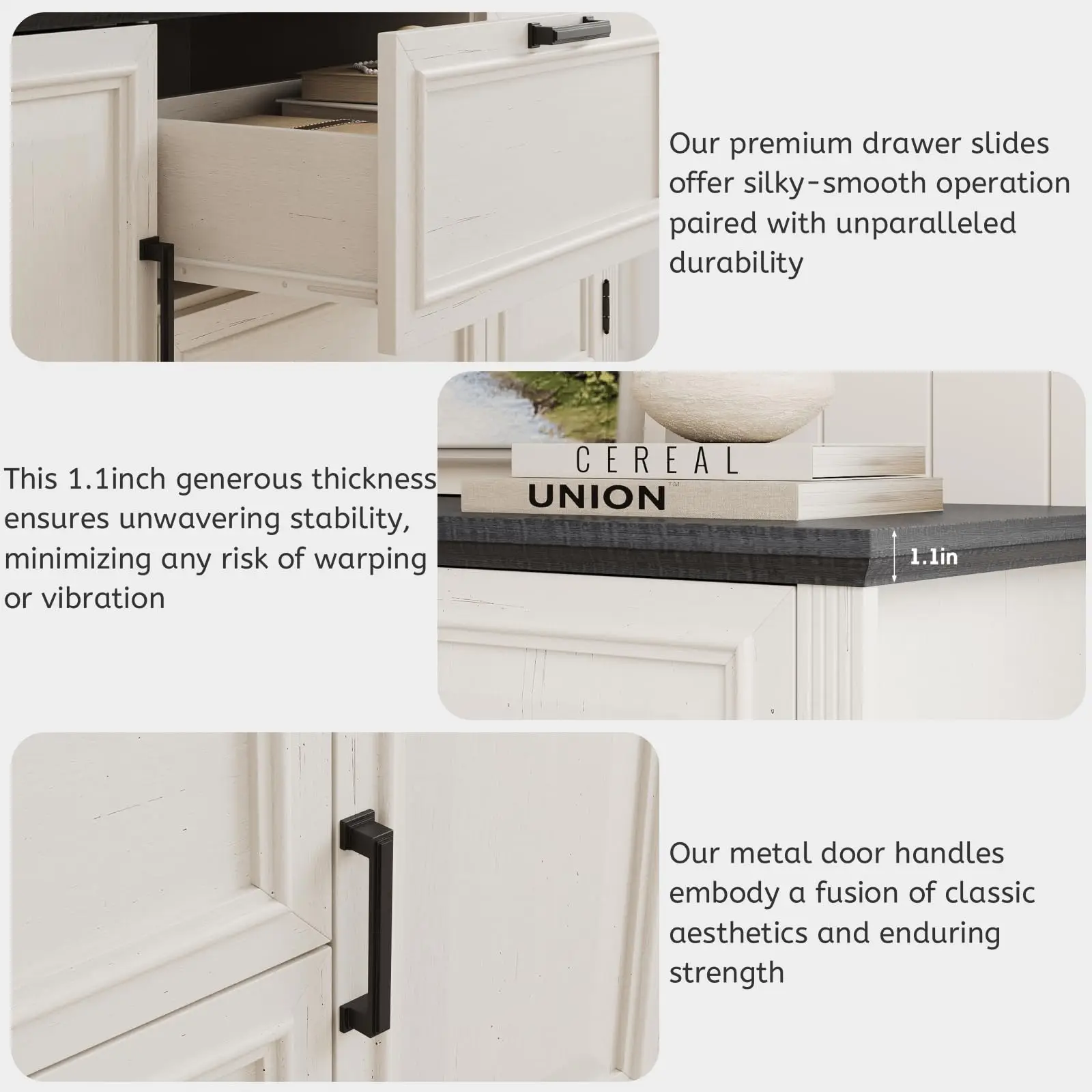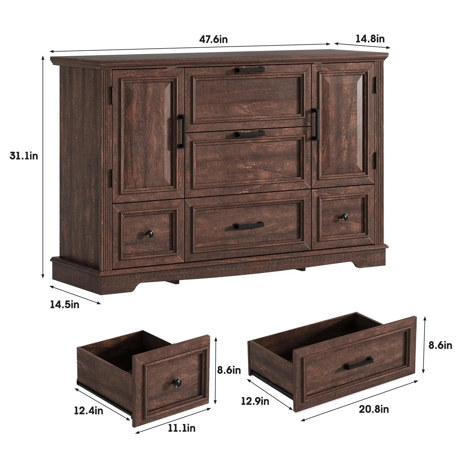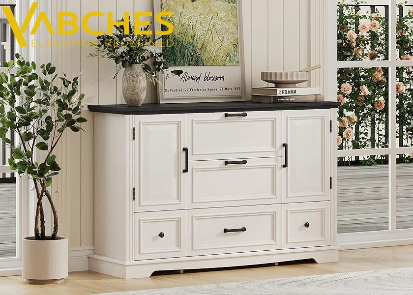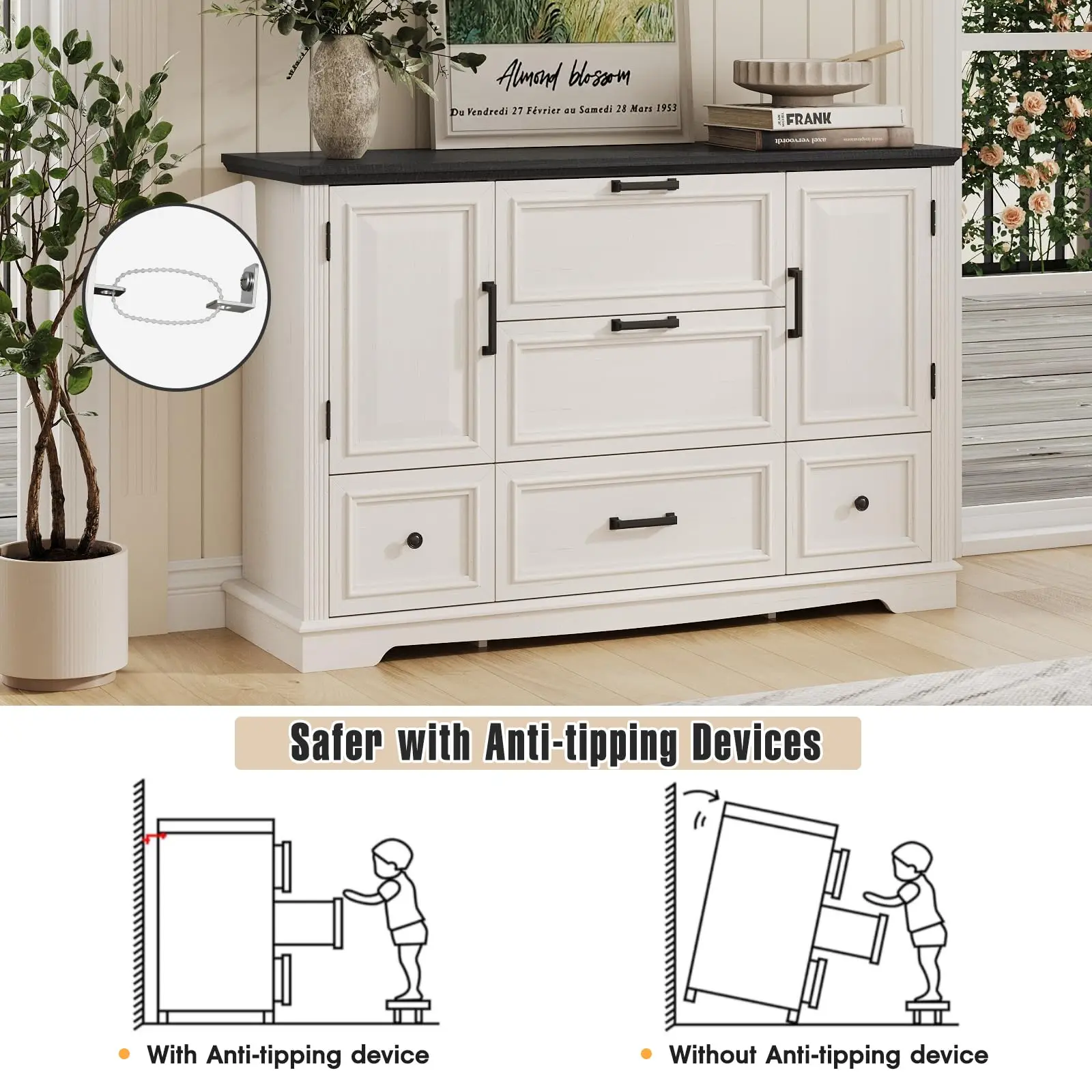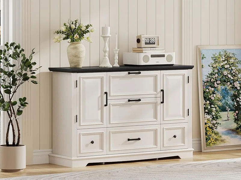 This wide dresser is made of high-quality medium density fiberboard and solid wood, which is sturdy and durable,harmless and wear-resistant,it can be used for a long time. Easy-pull drawers with metal handles for smooth opening and closing. And with anti-tipping devices,for prorecting your family's safe. For easy cleaning, just wipe it clean with a piece of damp cloth and get it air-dried