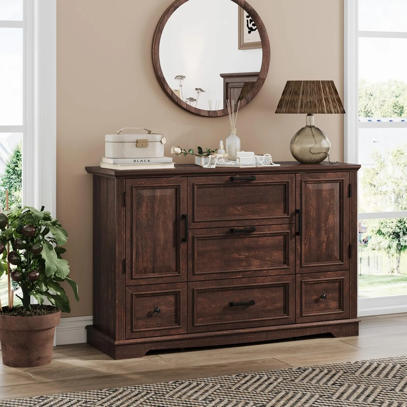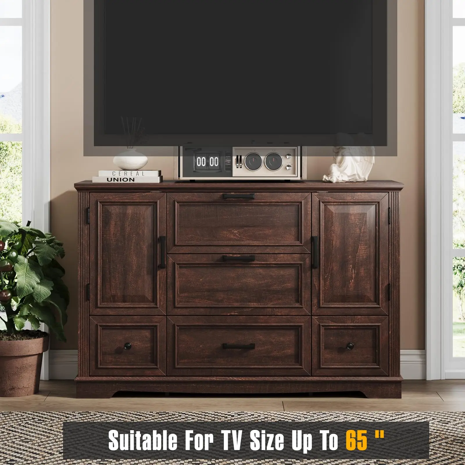 This dresser is very versatile uses. If you put it in the closet as bedroom furniture,it will very convenient for storing blankets, lingerie,sockes,ect. If you place it in the entryway or Hallway,it will offer a storage space for saving unit for the frequently used item. And if you place it in the living room,it can be as a TV stand to place the TV. The perfect combination of practicality and functionality is synonymous with this dresser