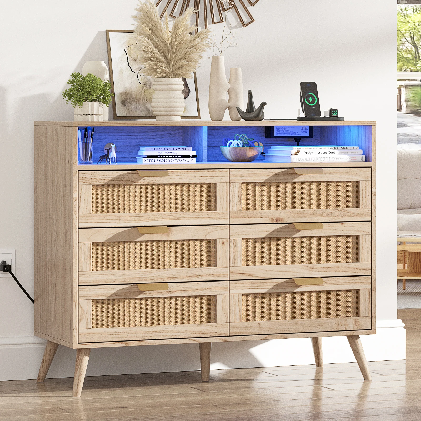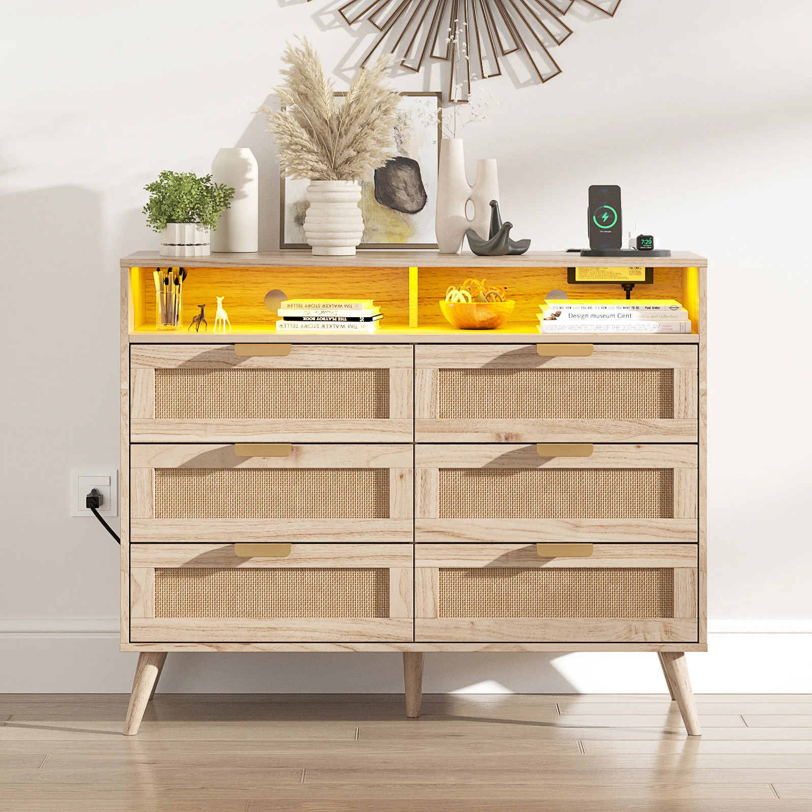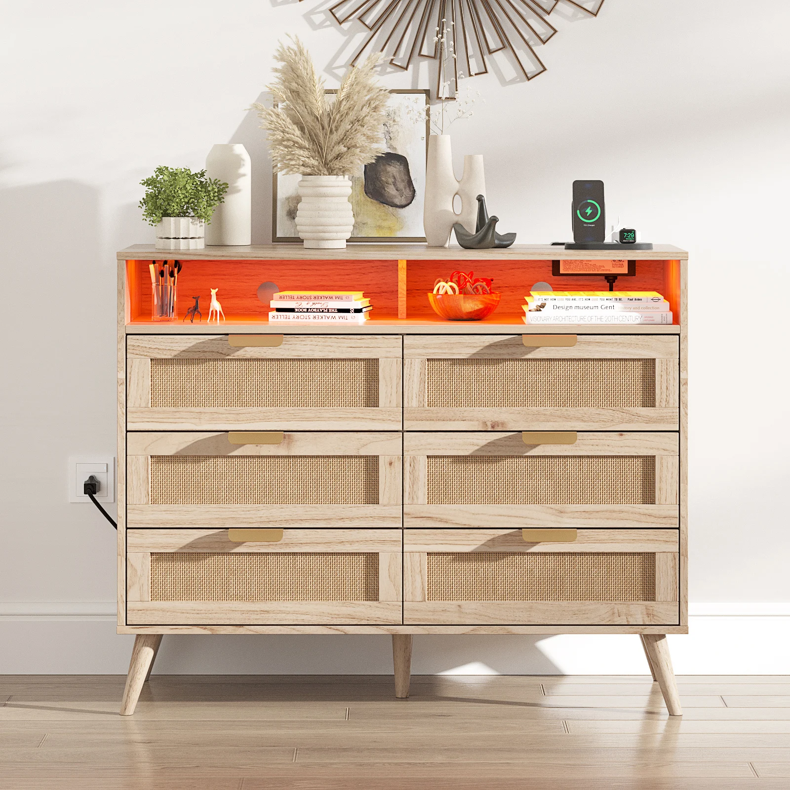 Rattan Dresser for Bedroom 6 Drawer Dresser with Power Outlet&LED Lights&5 Wood Legs