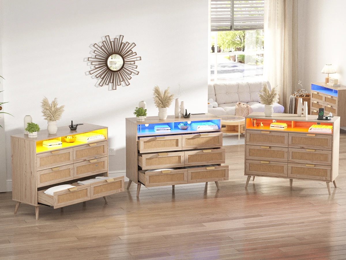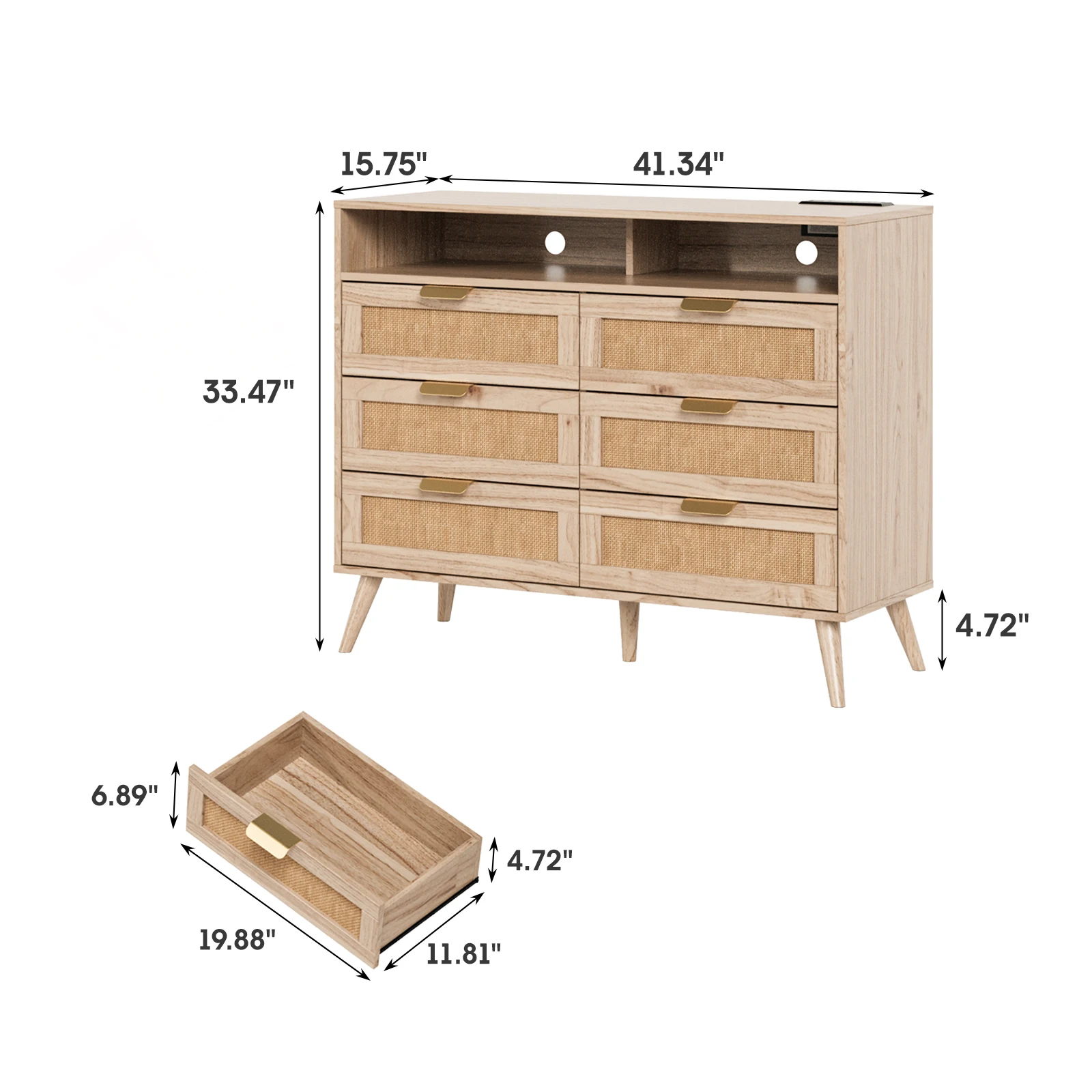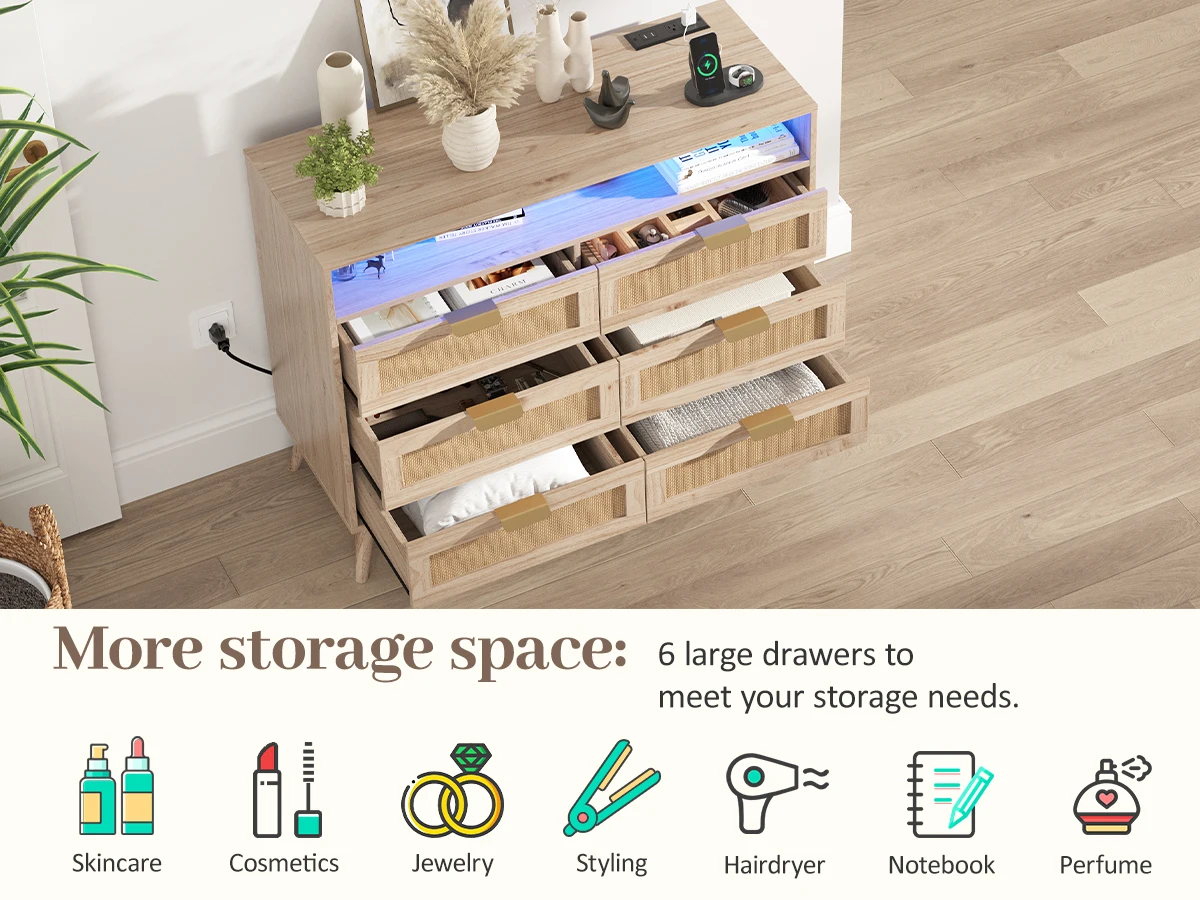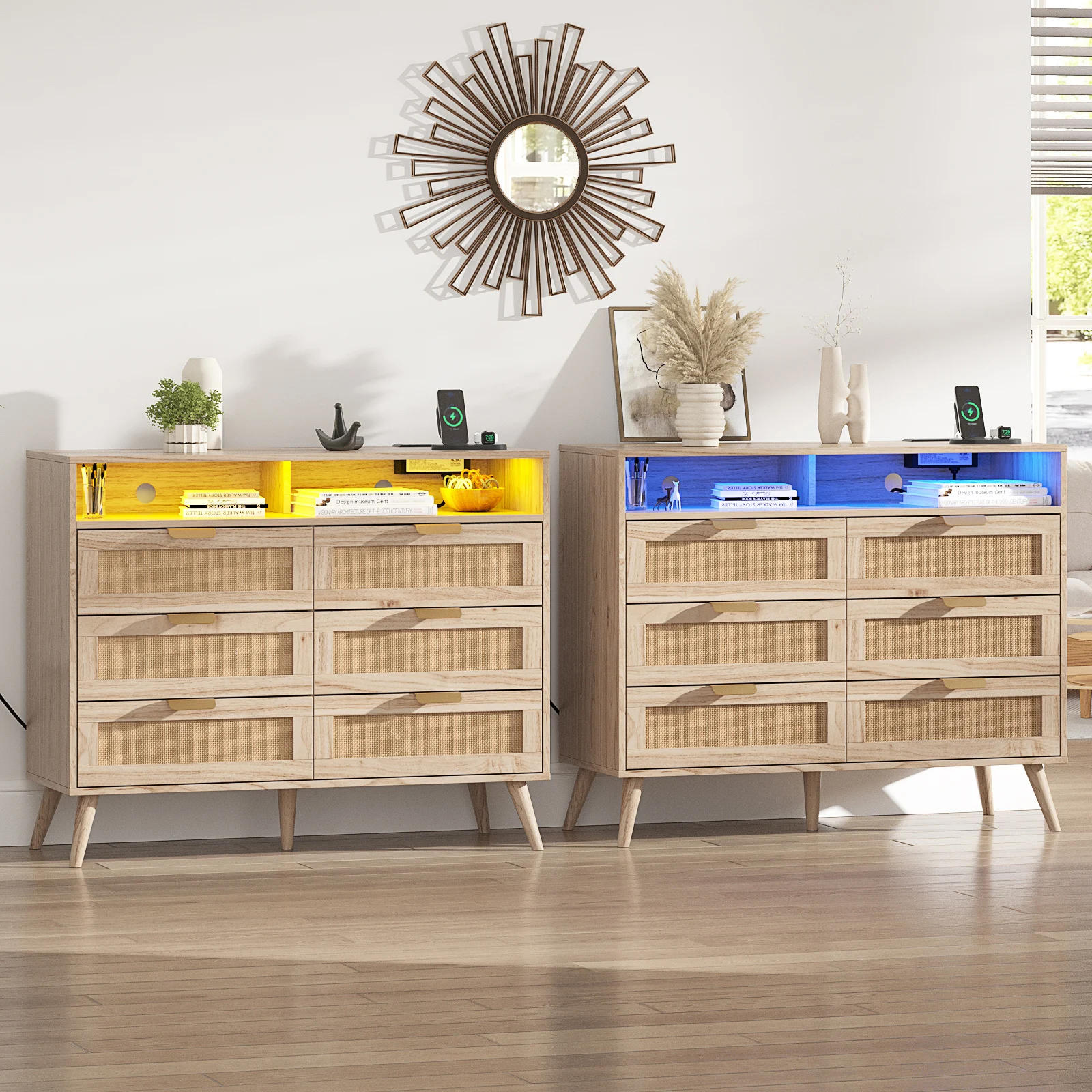 Rattan Dresser for Bedroom 6 Drawer Dresser with Power Outlet&LED Lights&5 Wood Legs