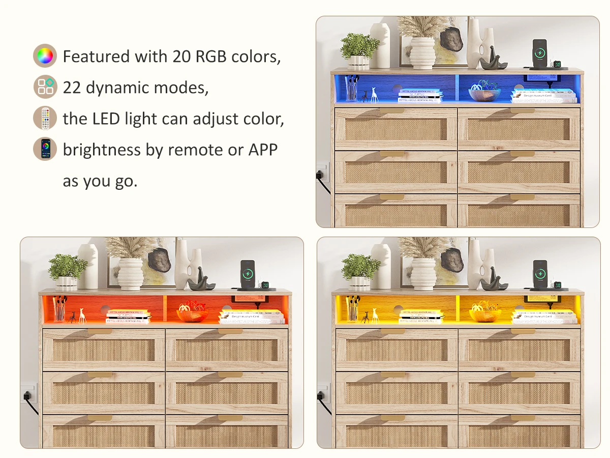 【Featured RGB LED Lights】: This 6 Drawers Dresser is equipped with smart RGB LED lights strip,which can be controlled by APP and remote control,it provides more than 20 RGB colors,22 dynamic modes for you to effortlessly create your favorite bedroom atmosphere
