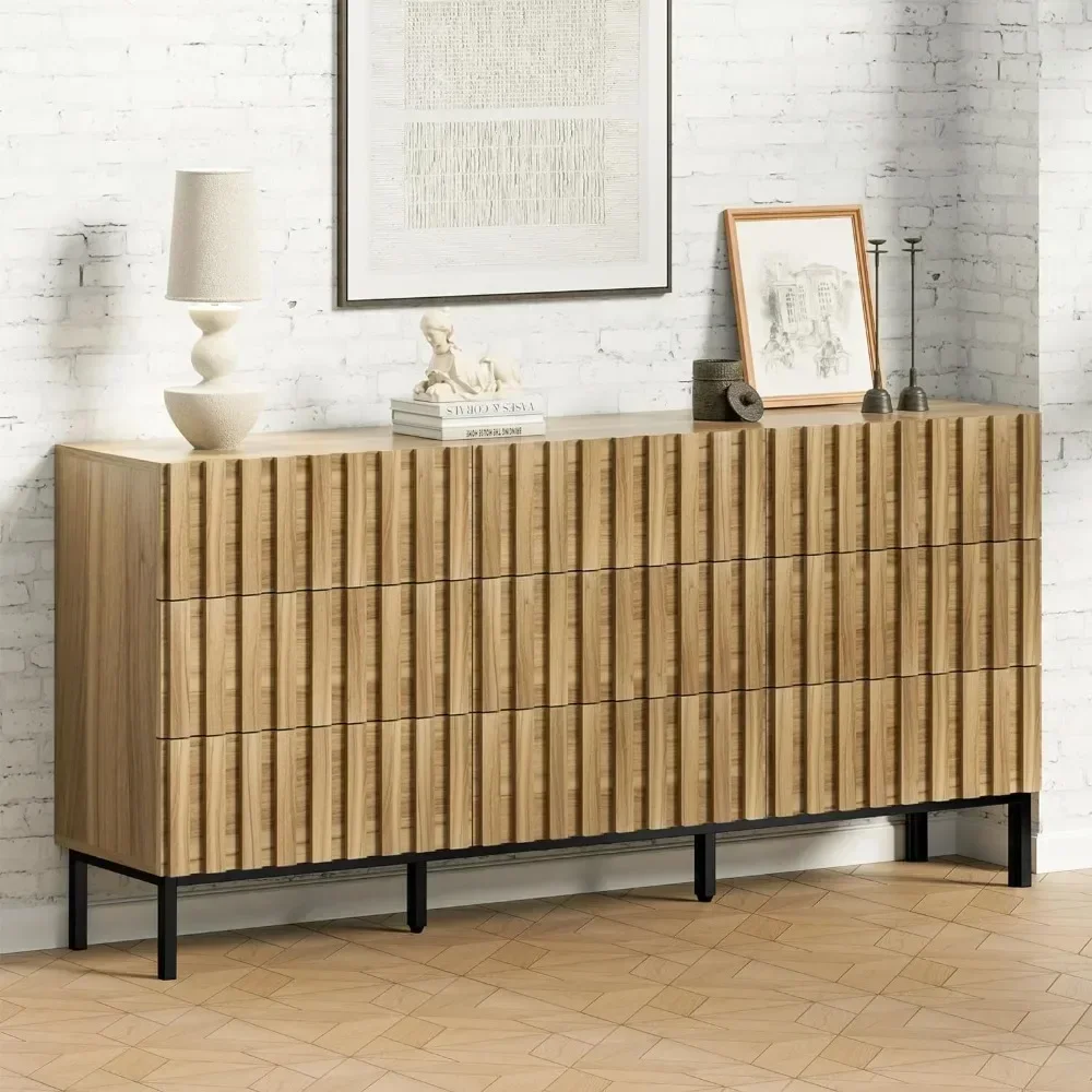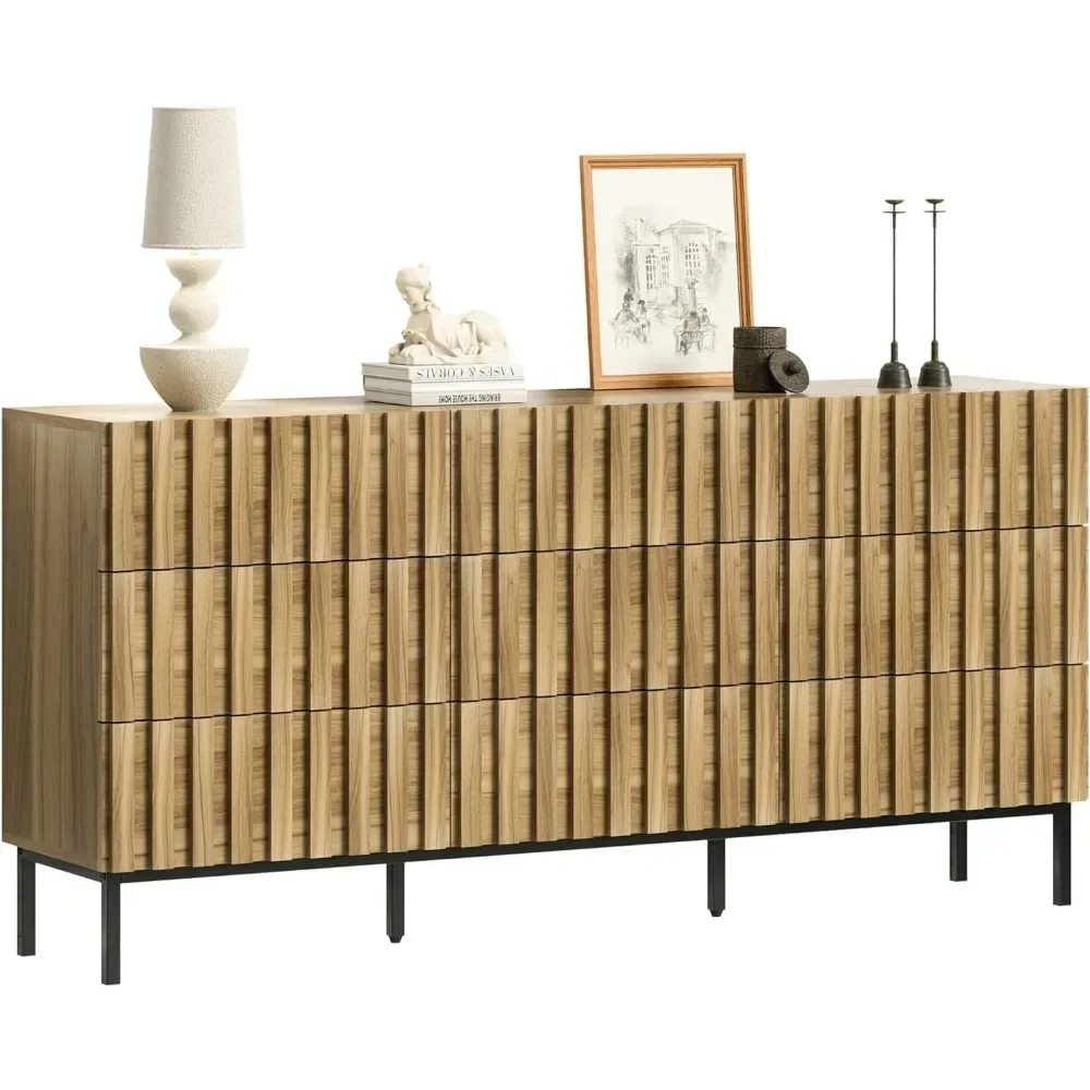 Mid Century Modern Dresser:With 9 large storate drawers,parallel fluted panels for free handles,black metal accent legs enhance stability and durability