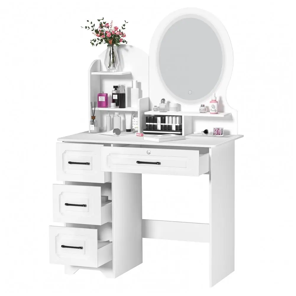 Makeup Desk with Mirror, Large Vanity Desk with Storage Shelves, 4 Drawers, Makeup Vanity Table with Light, Bedroom Dressing Table