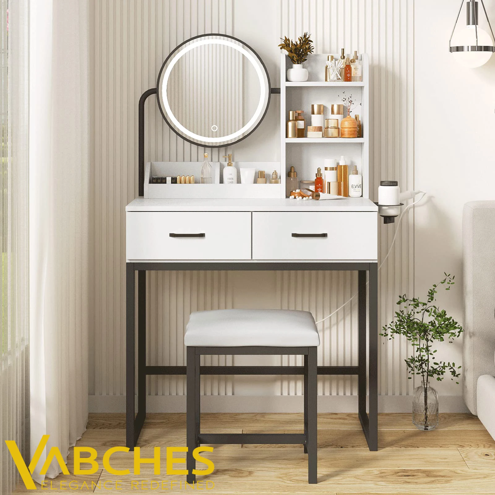 This makeup table have two modes,with power strip or without power strip. You can choose any of them accroding to your makeup needs. If you choose the vanity set with charging station,then it will very convenient for your hair dryer or other beauty electronic devices charging,and there are also comes with hair dryer stand.