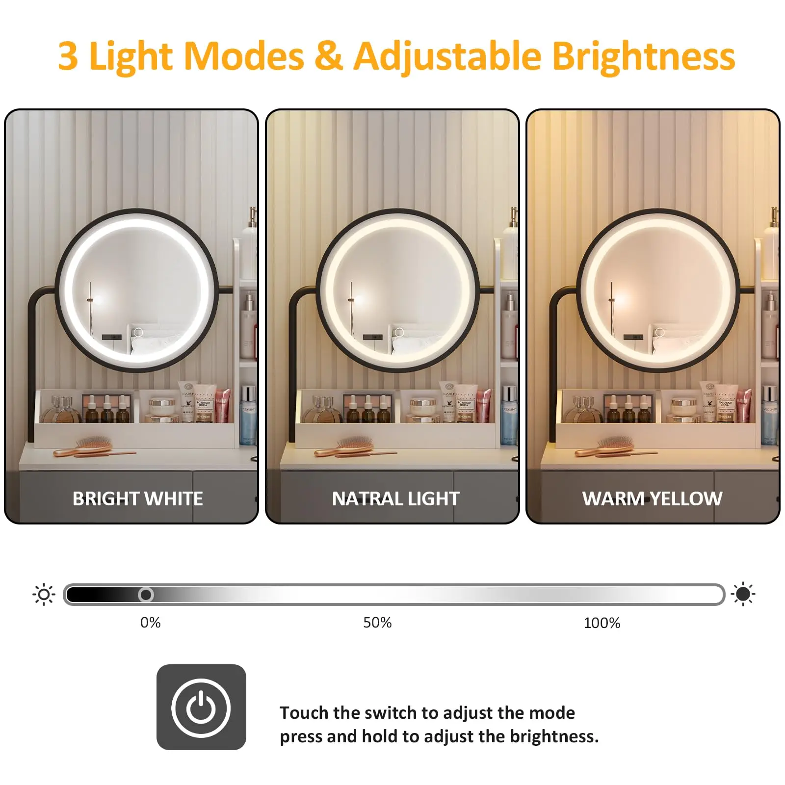 This dressing table equiped with a round lighted mirror which can be 360° rotated. And the LED lights in the mirror can be adjusted to 3 different colors:bright white, natural light and warm yellow. Long press the switch still can adjust the brightness. It provide convenience for your different makeup and scene needs.